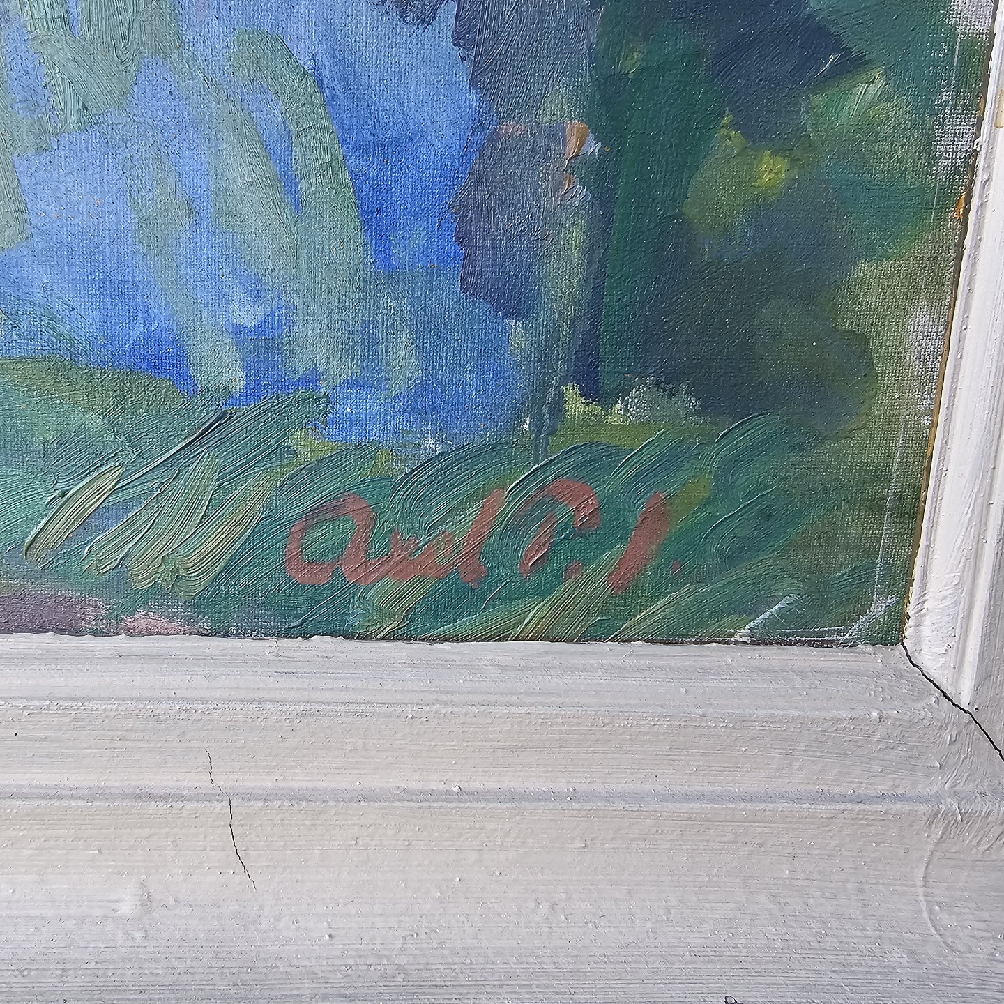 Oliemaleri på lærred monteret i hvidmalet ramme med motiv af en landevej