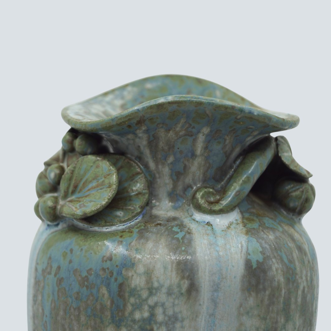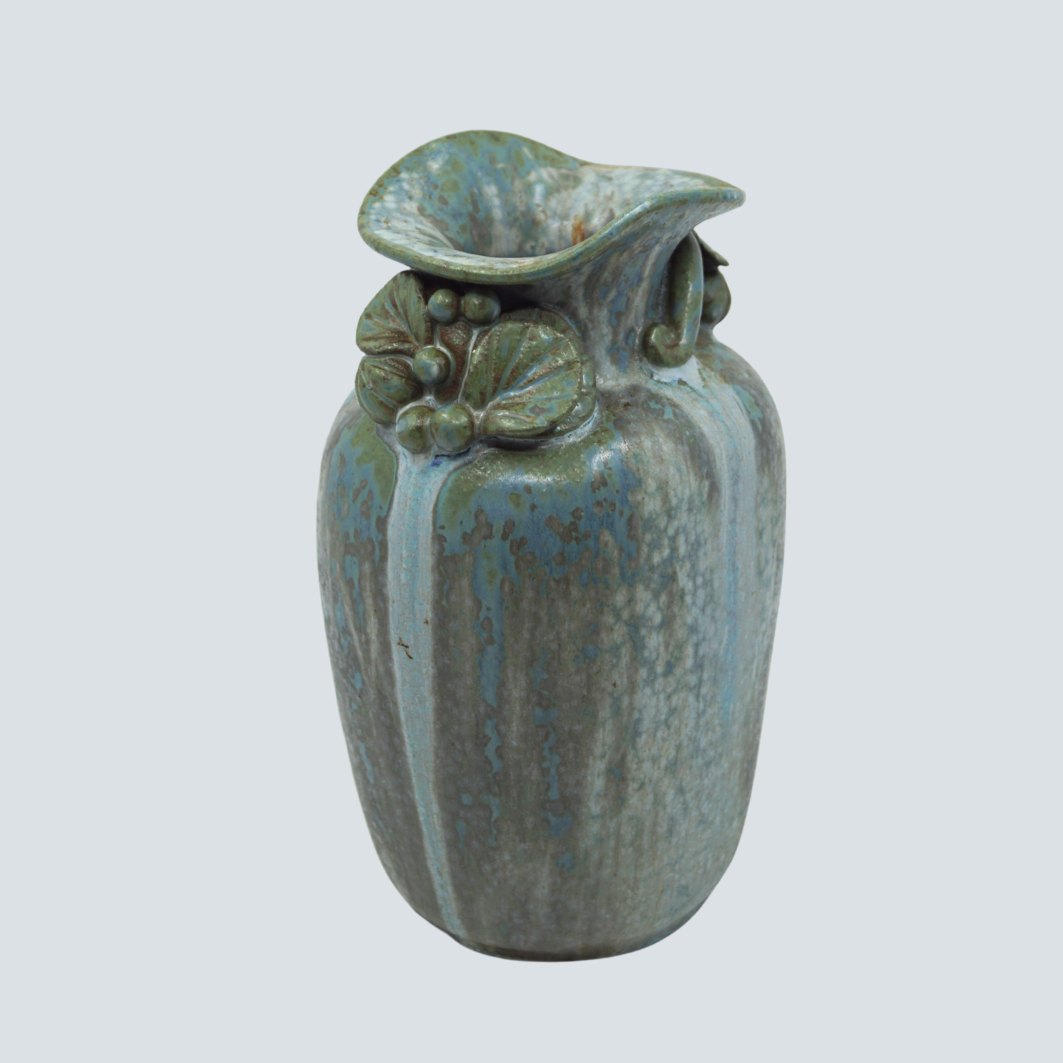 Text zugänglich auf Dänische: Arne Bang; Vase af stentøj, dekoreret med blomster. I blågrøn glasur. I god stand.