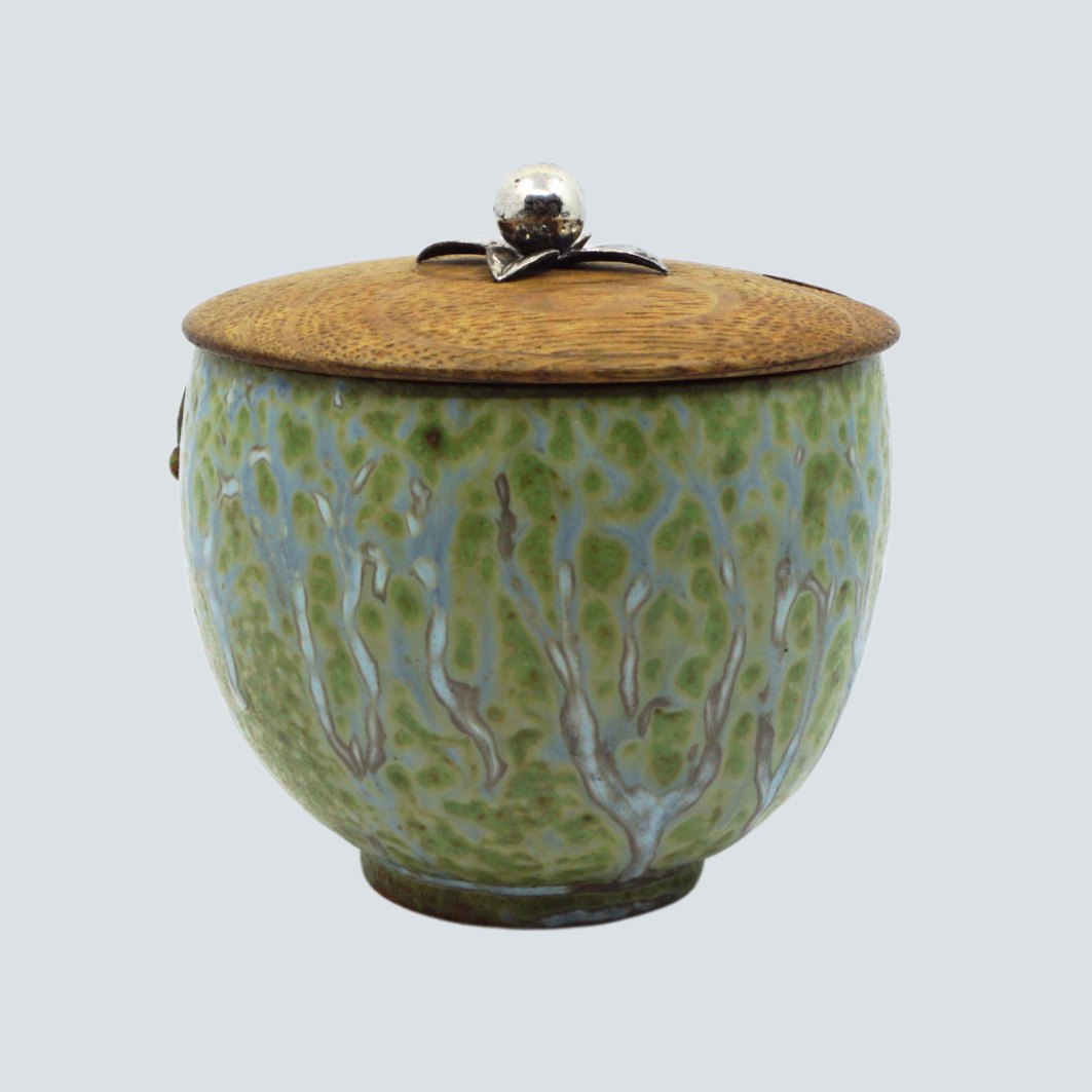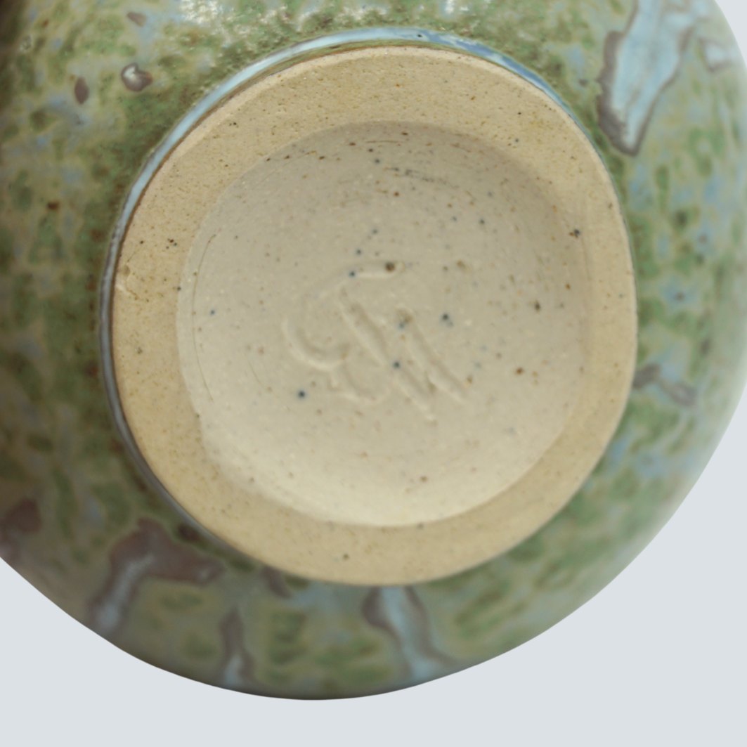 Text zugänglich auf Dänische: Arne Bang; Lågkrukke af stentøj med grøn og blå glasur. I god stand.