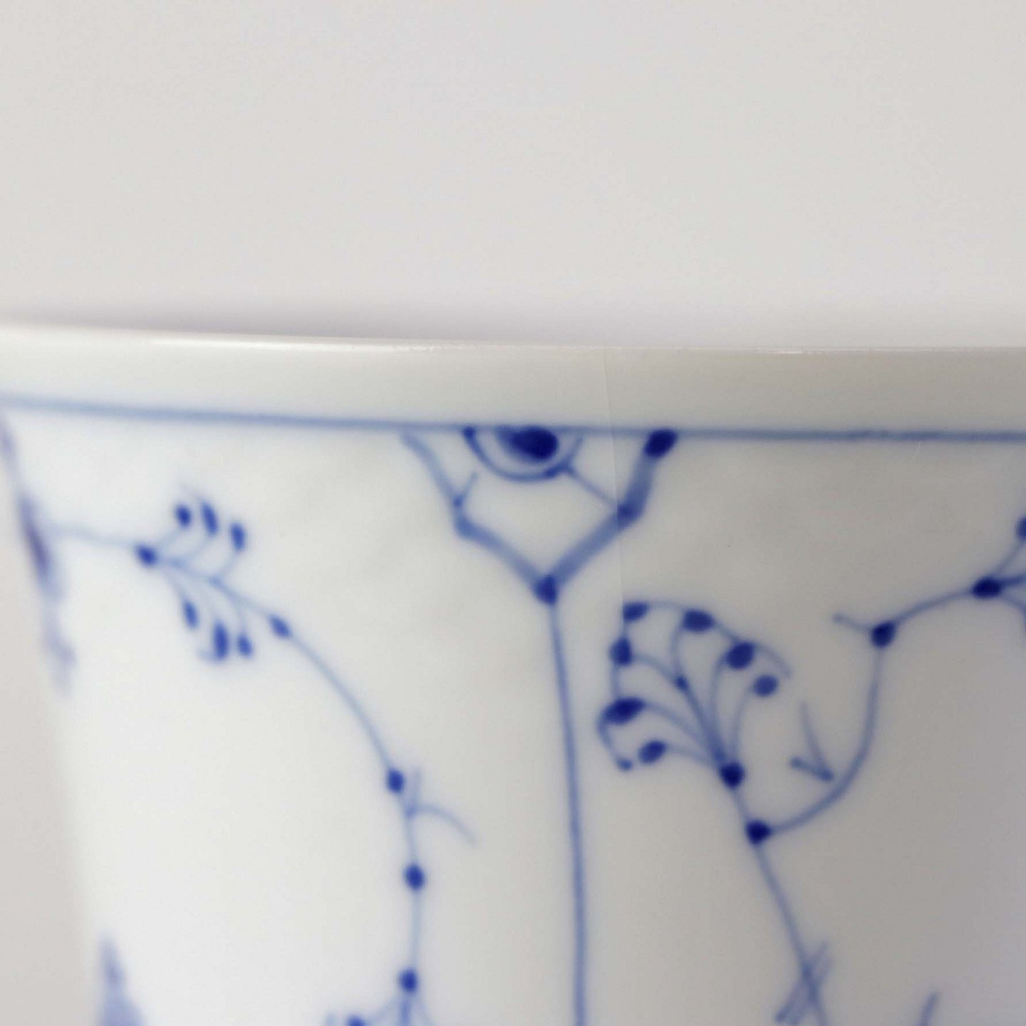 Service i hvid porcelæn med skelform og dekoration af blå blomsterranker.