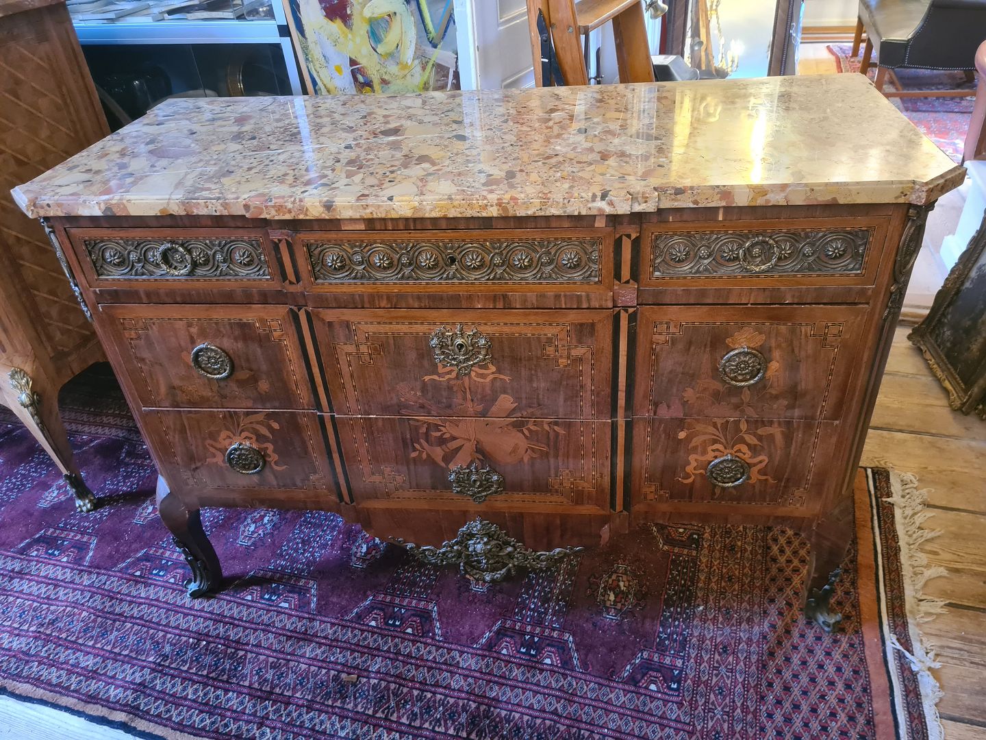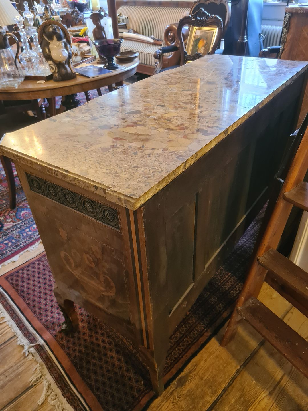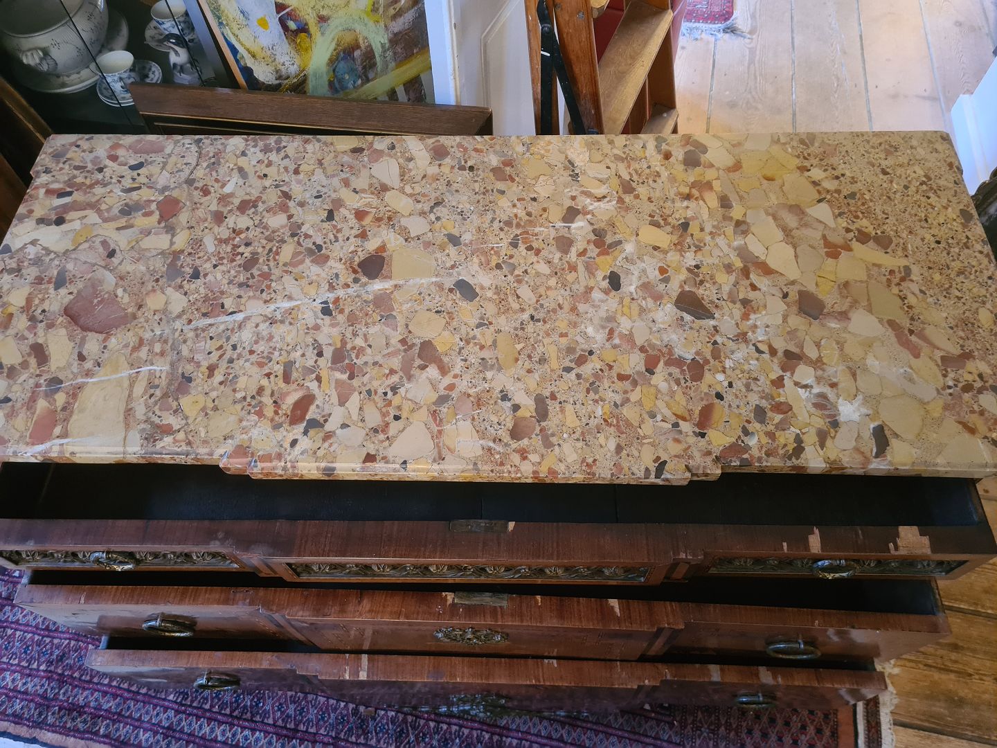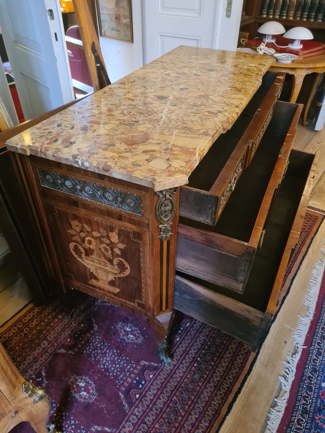 Text zugänglich auf Dänische: Antik kommode fra sidst i 1800 tallet i rokokostil med løstliggende marmorplade på toppen. Fremstår pæn og funktionsdygtig dog med enkelte finér skader øverst på skufferne (billede) og umiddelbart uden nøgle.