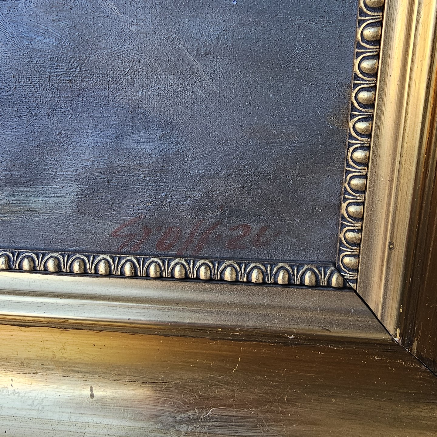 Oliemaleri på lærred monteret i guldramme med motiv af to børn på en landsbyvej