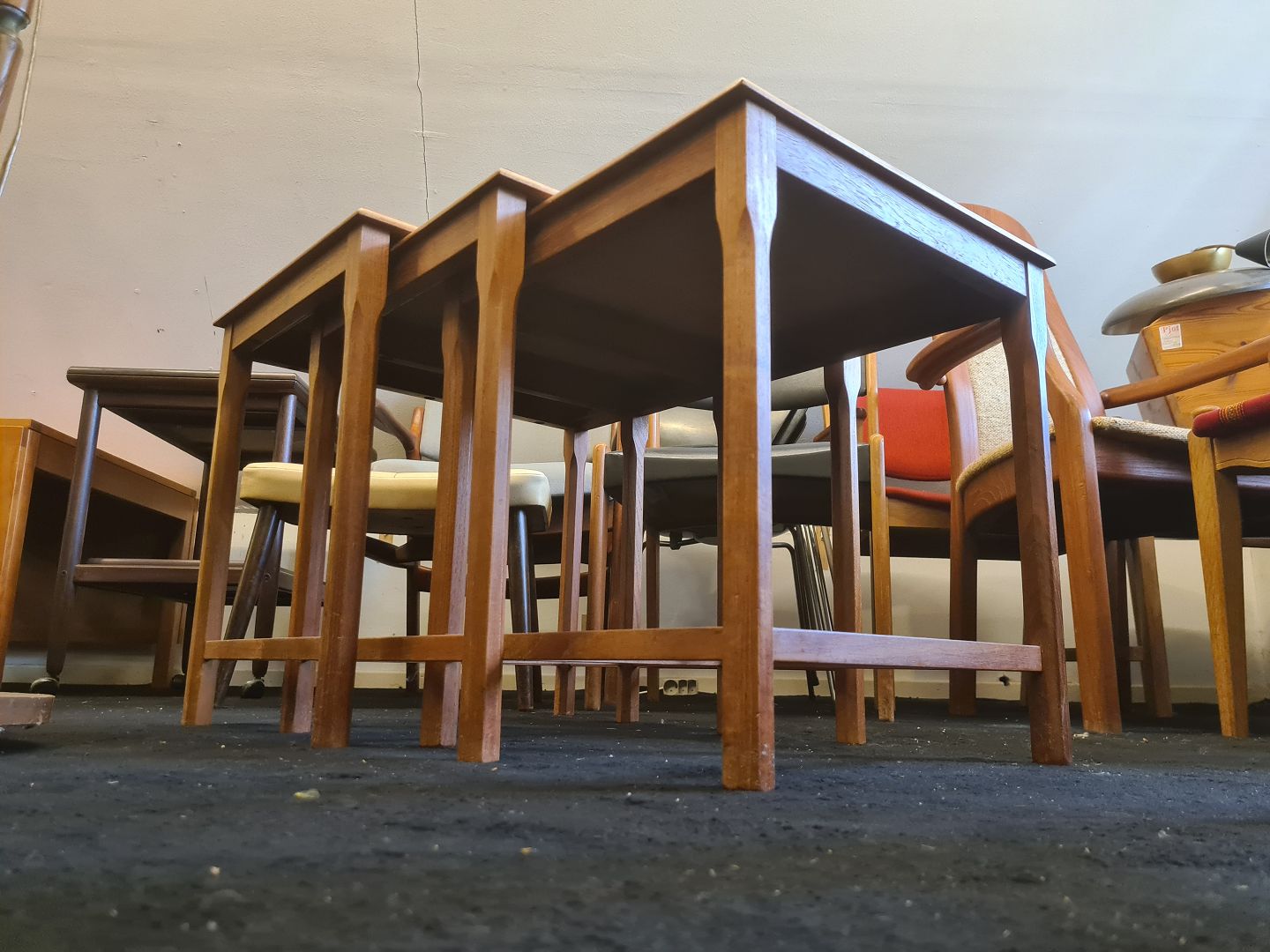 Indskudsborde fra 1970'erne i eg og med kakler. Fremstår pæne og velholdte uden nævneværdige brugsspor.
