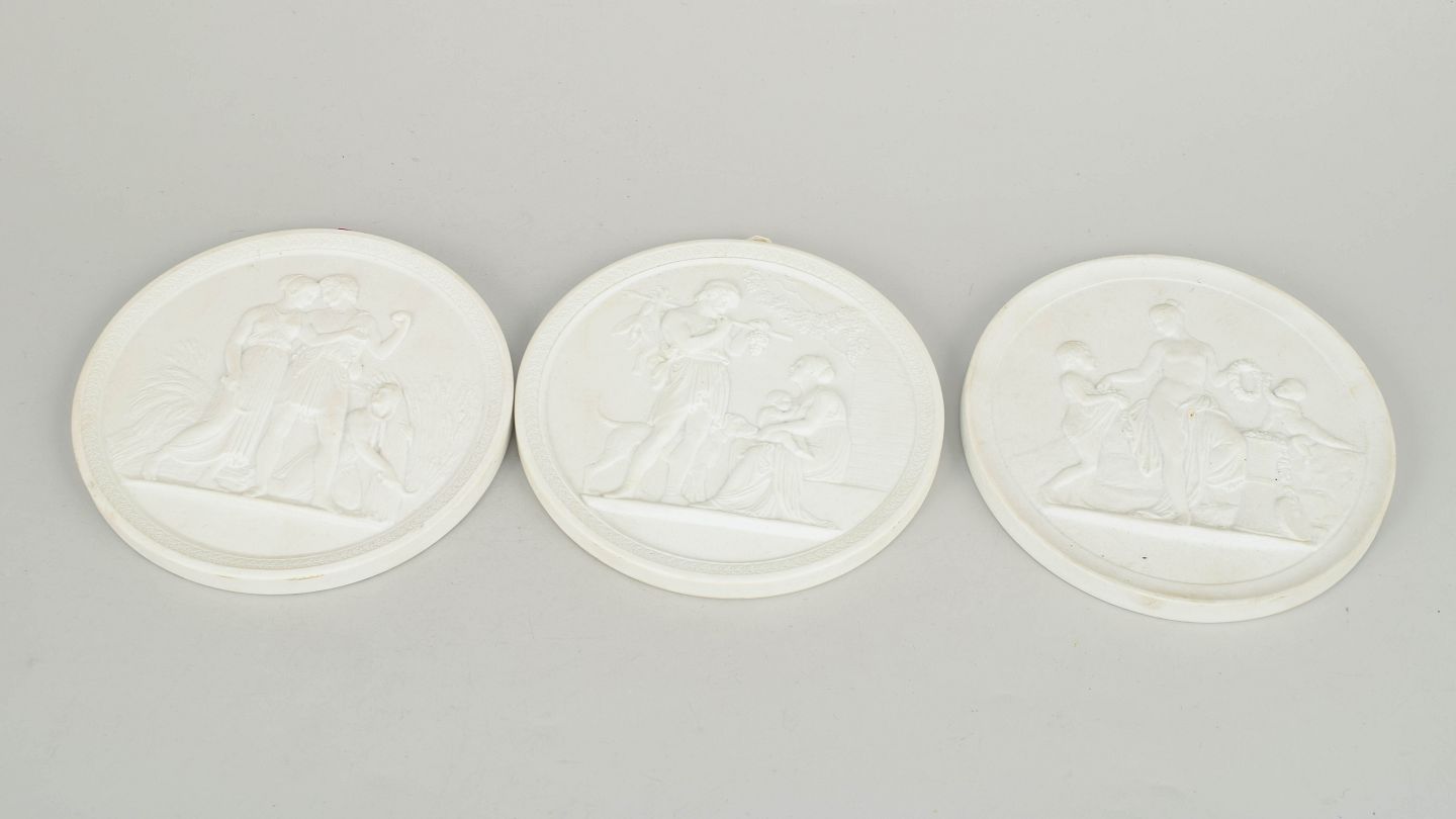 Relieffer i hvidt uglaseret porcelæn med klassiske motiver efter Bertel Thorvaldsen, udført i fin biscuit med detaljeret figurdekoration og ophæng på bagsiden.