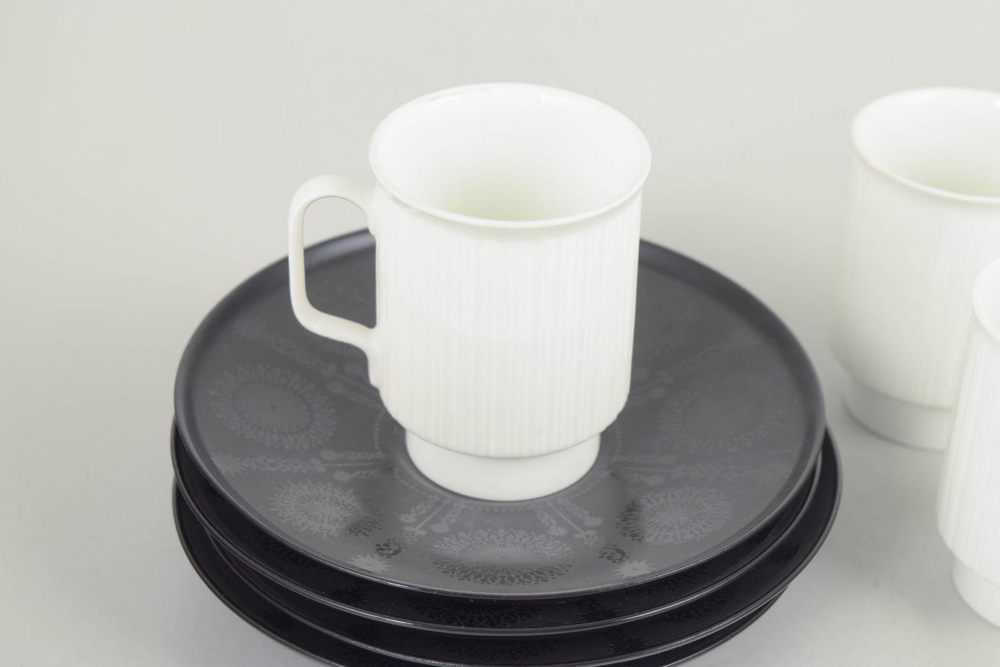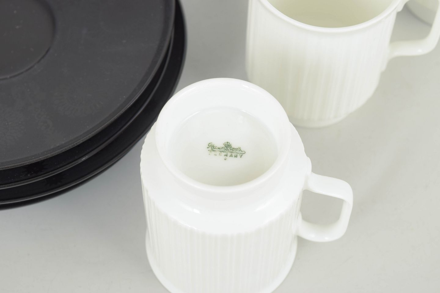Elegante espressokopper i porcelæn med tilhørende underkopper, udført i et enkelt og funktionalistisk formsprog karakteristisk for Tapio Wirkkalas arbejde for Rosenthal i 1980’erne.