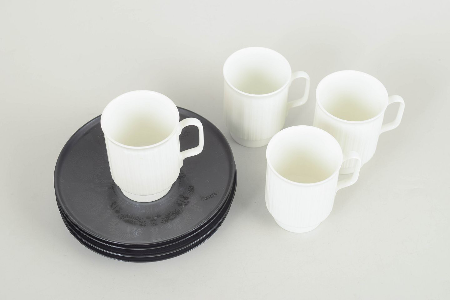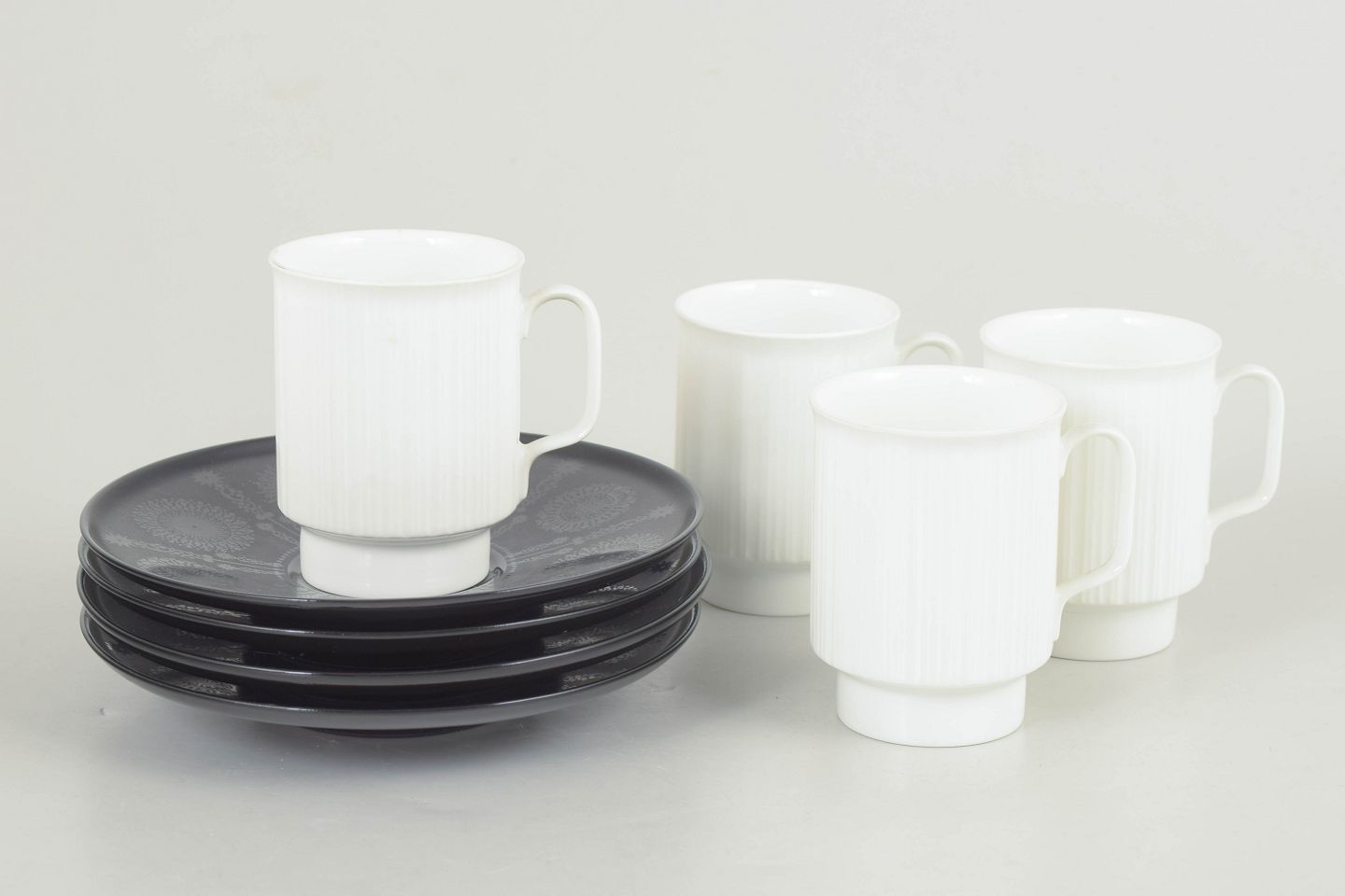 Text zugänglich auf Dänische: Tapio Wirkkala for Rosenthal, sæt af fire espressokopper med tilhørende underkopper.
