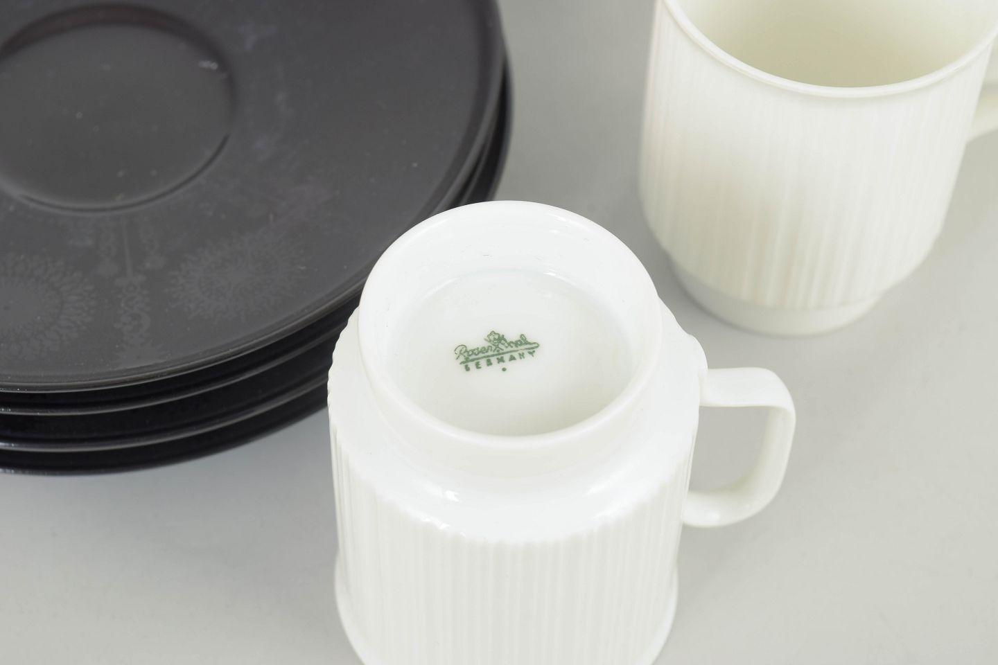 Elegante espressokopper i porcelæn med tilhørende underkopper, udført i et enkelt og funktionalistisk formsprog karakteristisk for Tapio Wirkkalas arbejde for Rosenthal i 1980’erne.