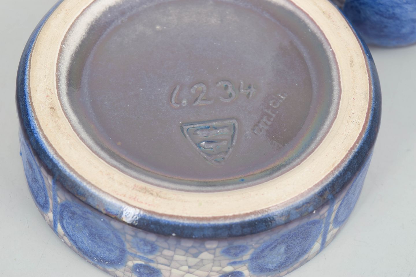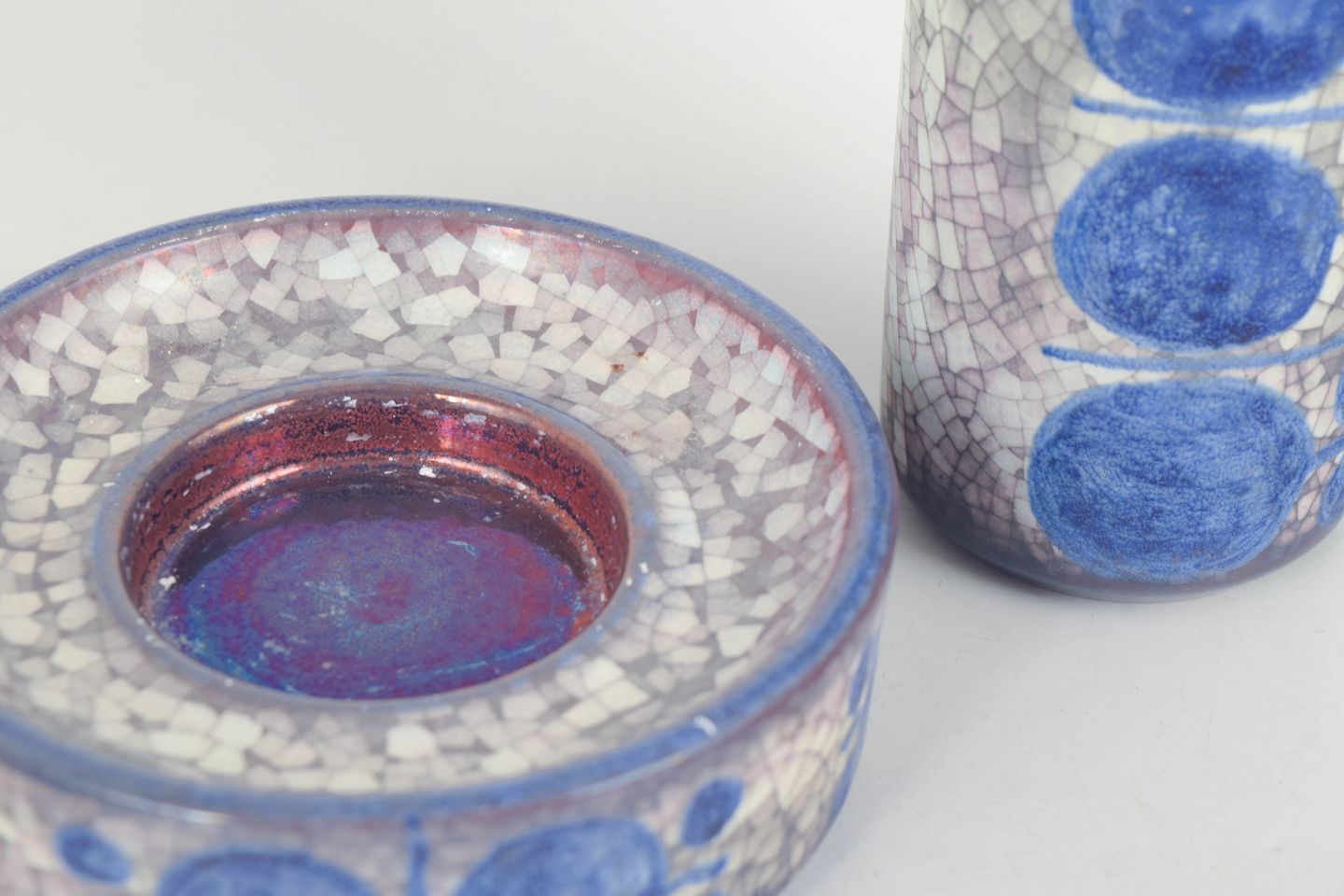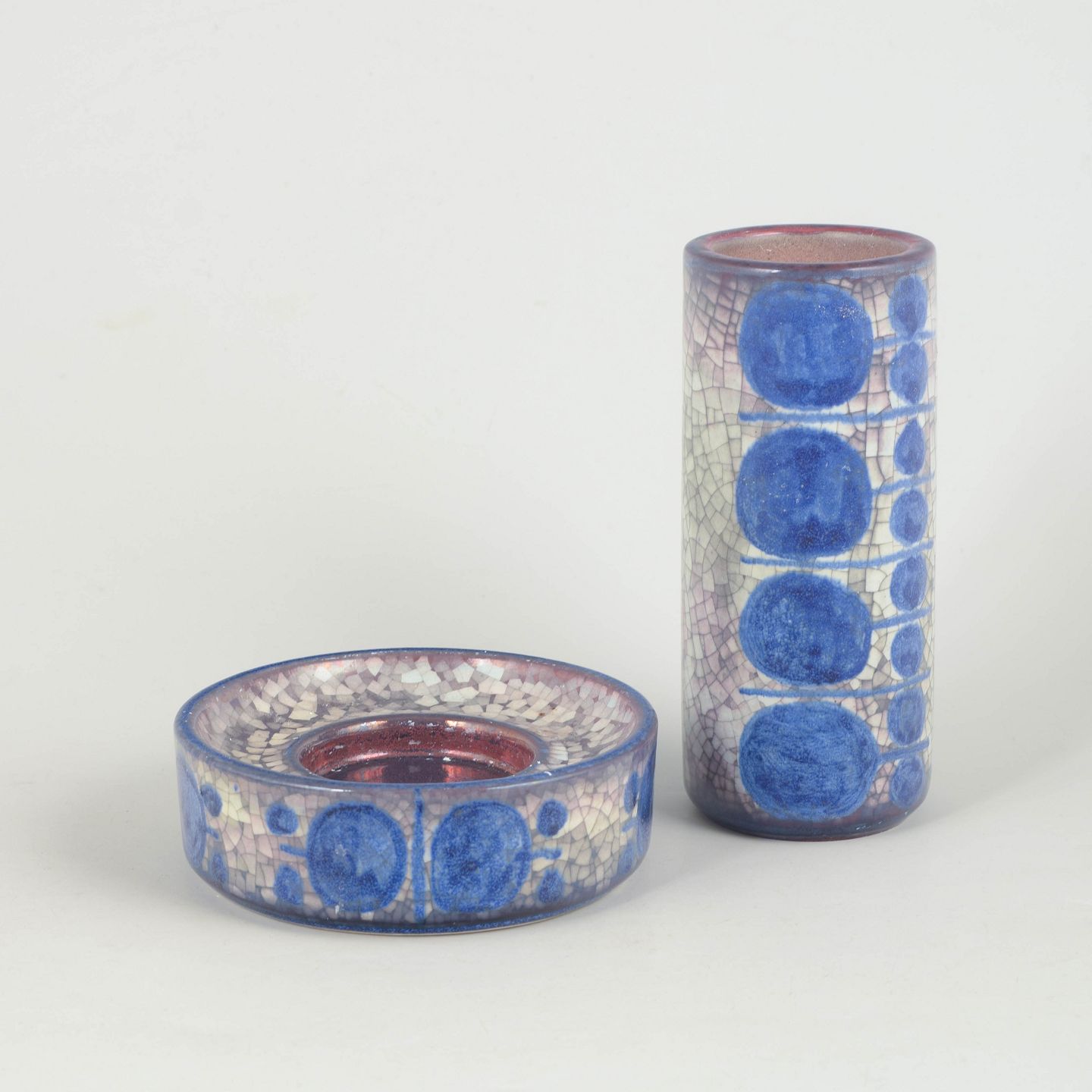 lysestage og vase i stentøj med karakteristisk reliefdekoration og blå glasur. Klassisk Bornholm arbejde med dekorative cirkelmotiver og tydelig håndværksmæssig kvalitet. Stemplet i bunden.