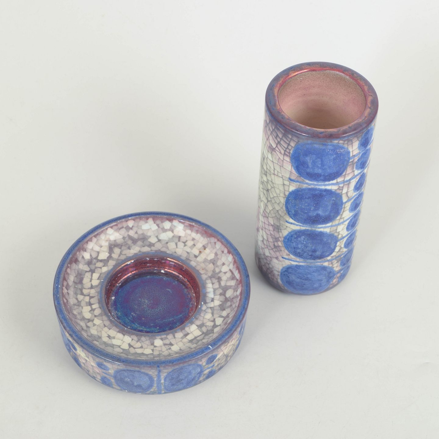 Dimensioner: Lysestage: H. 4 cm, D. 11 cm. Vase: H. 14 cm, D. 6 cm.