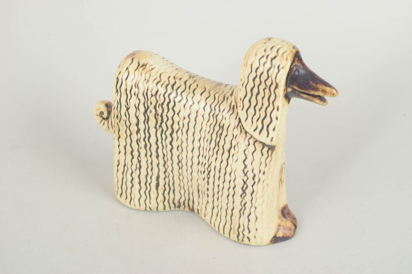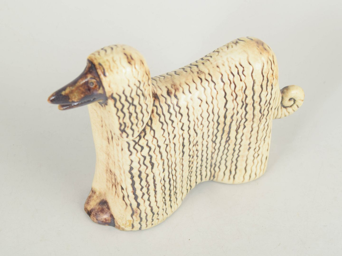 Dekorativ hundefigur i stentøj med stiliseret, langstrakt form og karakteristisk bølgende pels gengivet i relief. Glasur i varme beige og brune nuancer, typisk for Lisa Larssons figurunivers fra perioden.