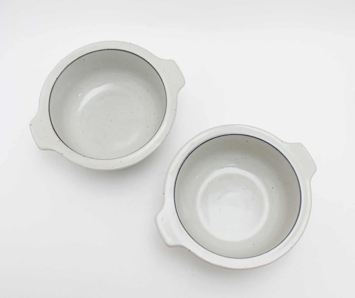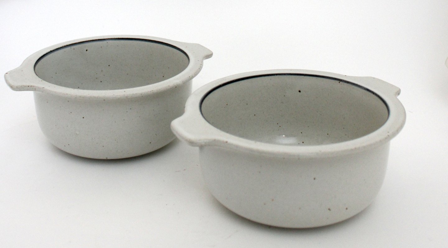Knabstrup, Skåle med hank eller ører i stentøj, 2 stk. Højde 6 cm. Diameter 14 cm. Fin stand. Pris for sættet: 175 kr.