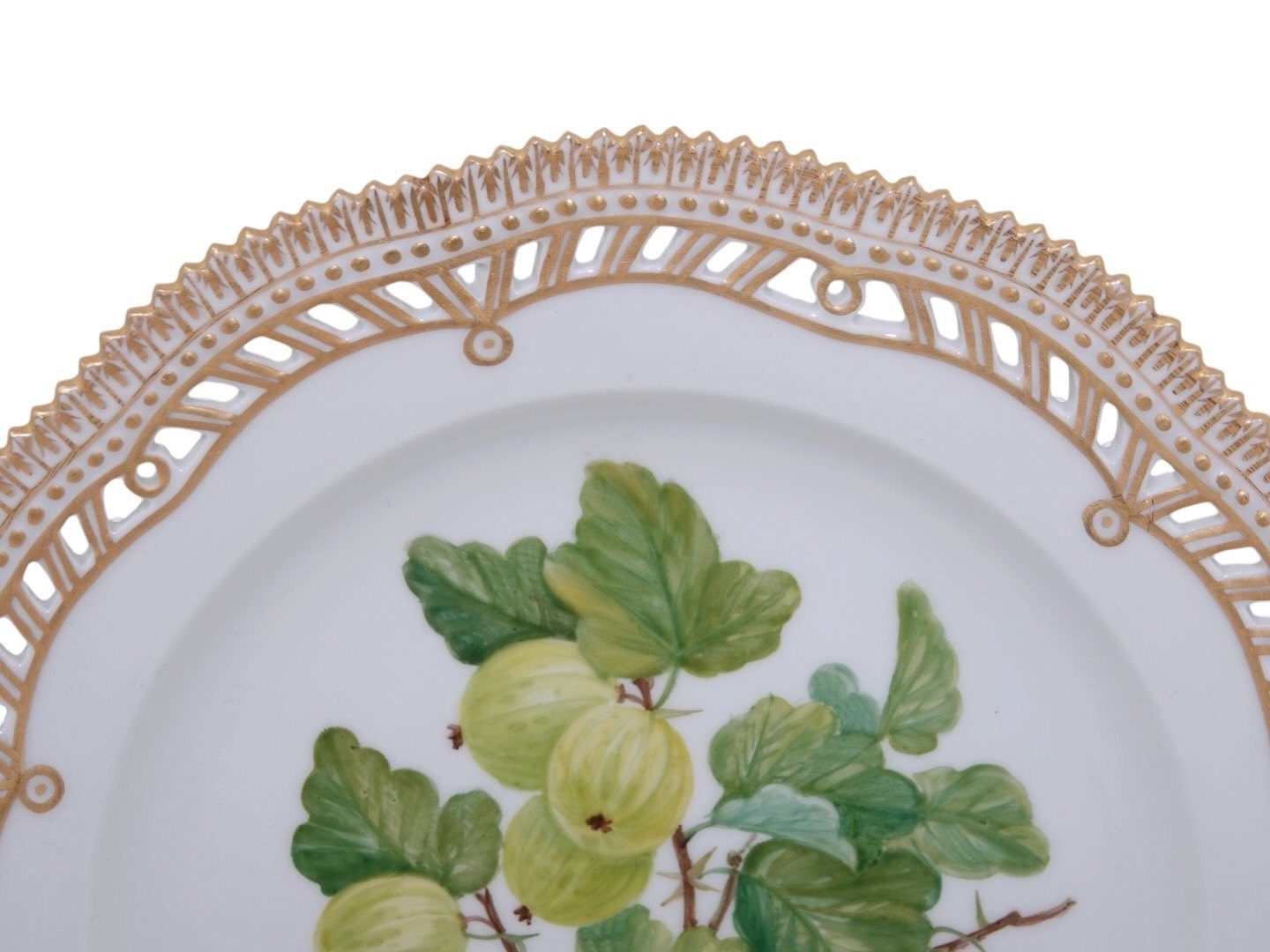 Royal Copenhagen Flora Danica, frugttallerken dekoreret med stikkelsbær og med gennembrudt kant.