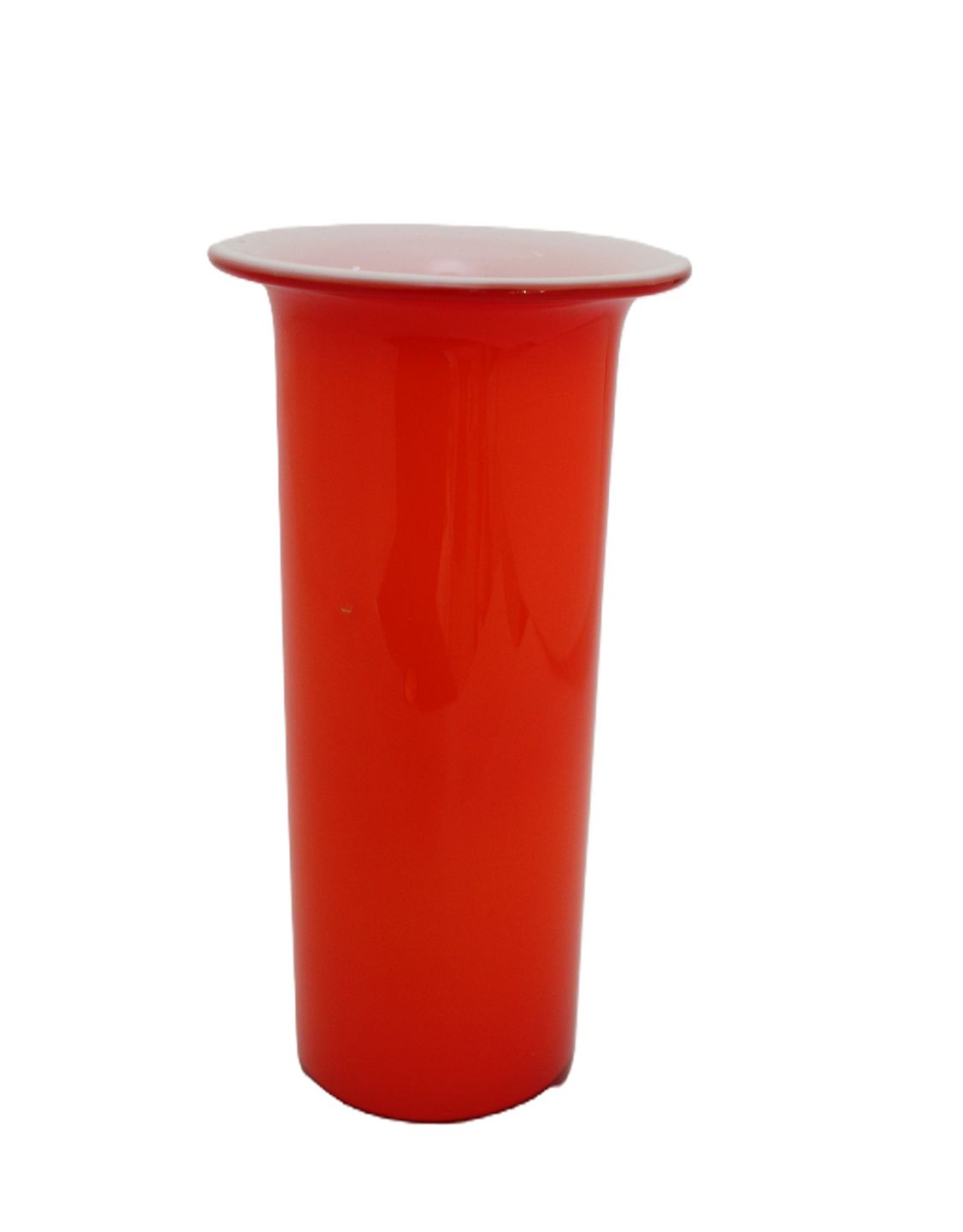 Holmegaard, Regnbue, Orange cylindrisk vase med hvidt opalglas indvendig og på den udsvajede kant. Designet af Michael Bang i 1970. Vasen har et slag midtpå og en større luftboble, se foto. Ellers i fin stand. Højde 17 cm. Øverste diameter 8 cm. Pris: 325 kr. Lager: 1