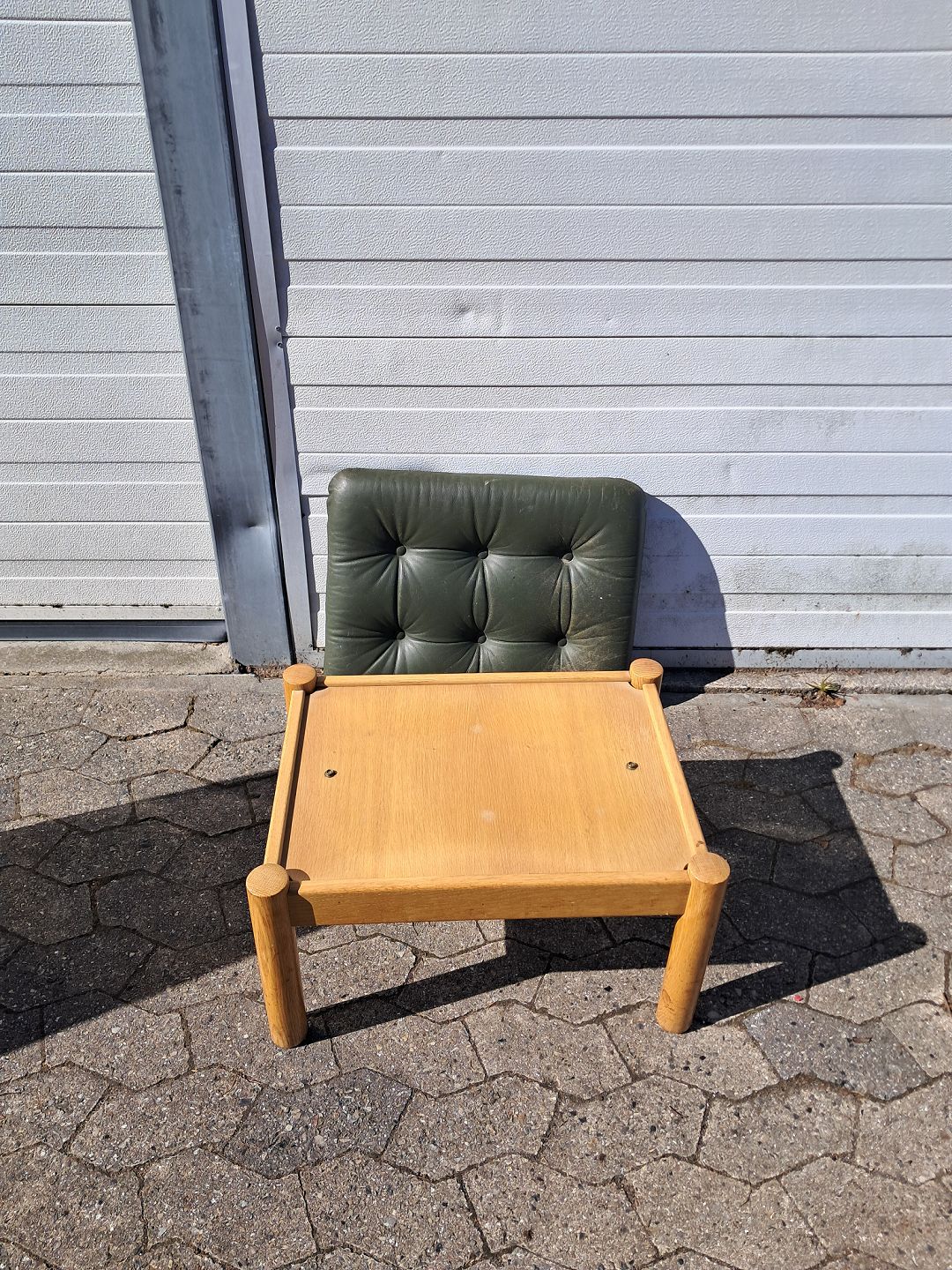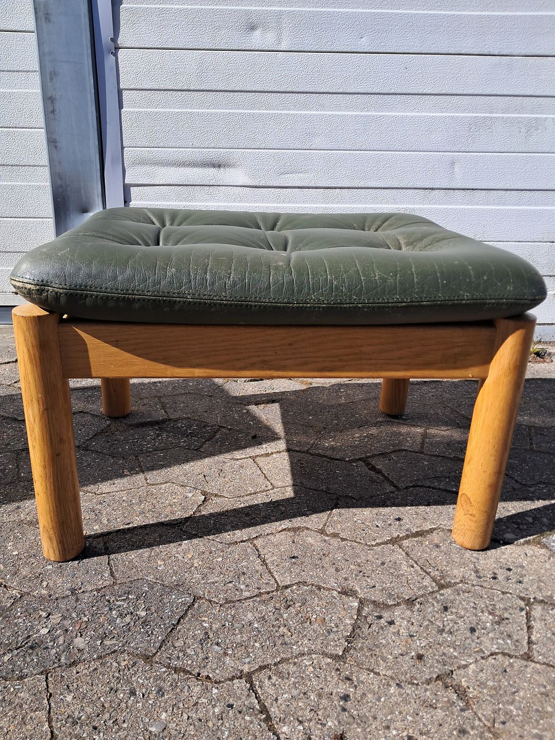 Skammel i massivt egetræ med læderhynde, fra 1980erne.