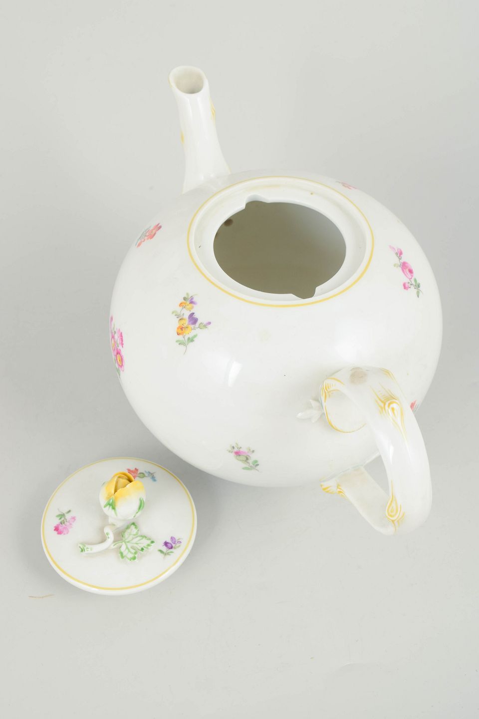 Tekande i porcelæn håndmalet med polykrome blomster og dekoreret med guldkant. Rund korpus med svungen tud og elegant hank samt låg med knop, udført i klassisk Meissen stil fra midten af det 20. århundrede. Undersiden mærket med Meissen krydssværd, første sortering.