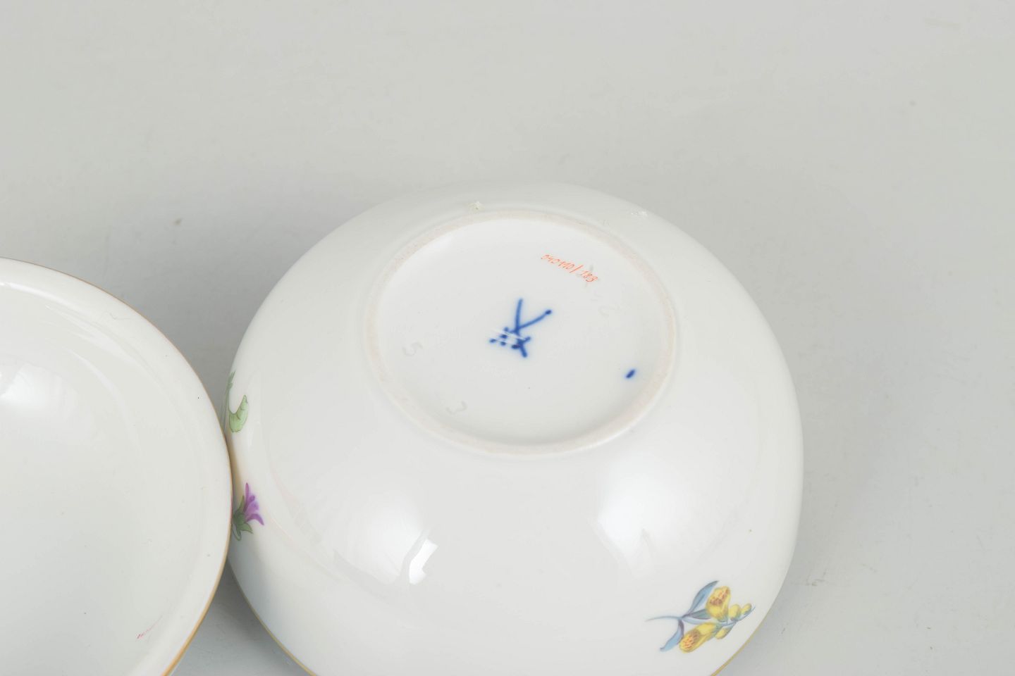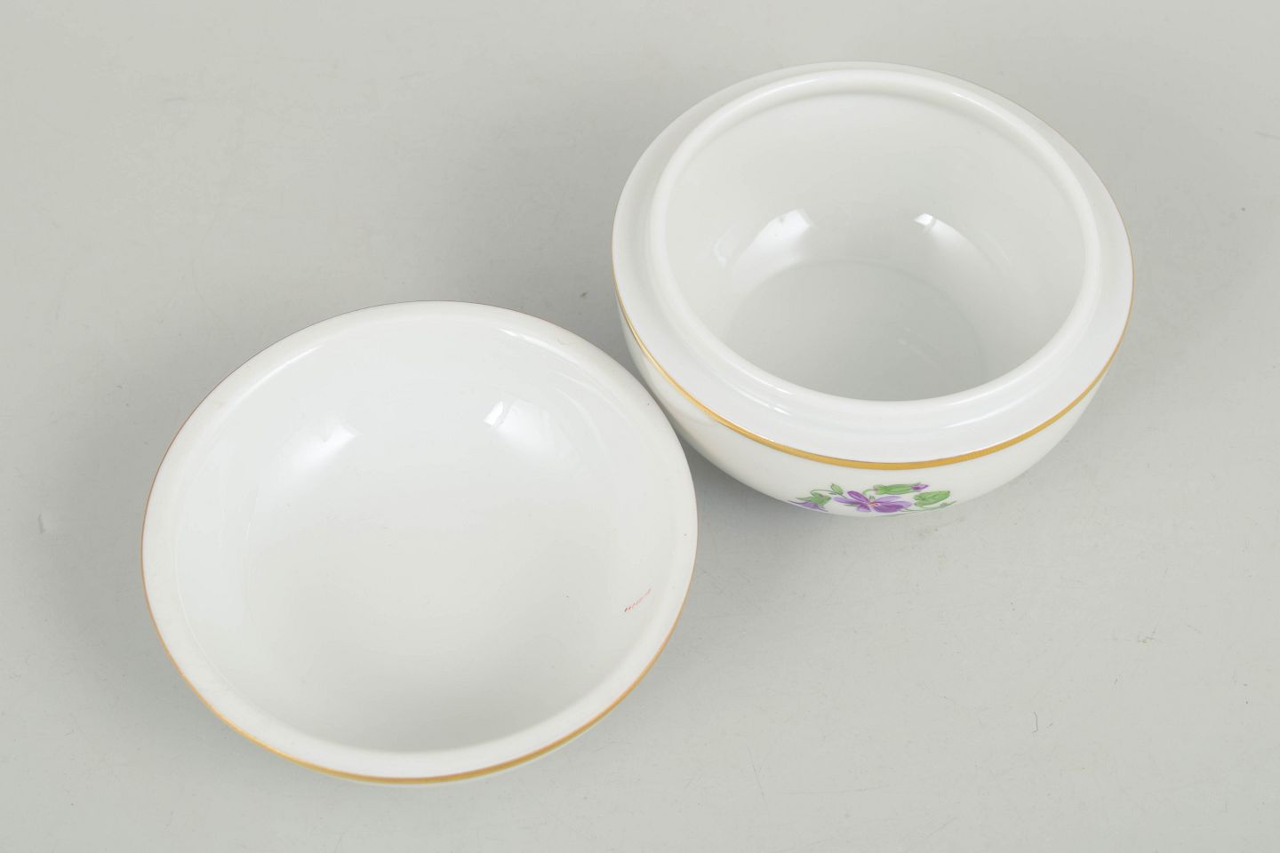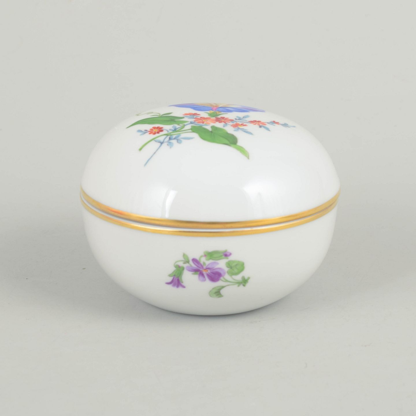 Rund lågkrukke i porcelæn håndmalet med polykrome blomster og dekoreret med guldkant. Klassisk Meissen udførelse fra midten af det 20. århundrede med fint afstemt låg og elegant, enkel form. Undersiden mærket med Meissen krydssværd. 3. sortering.