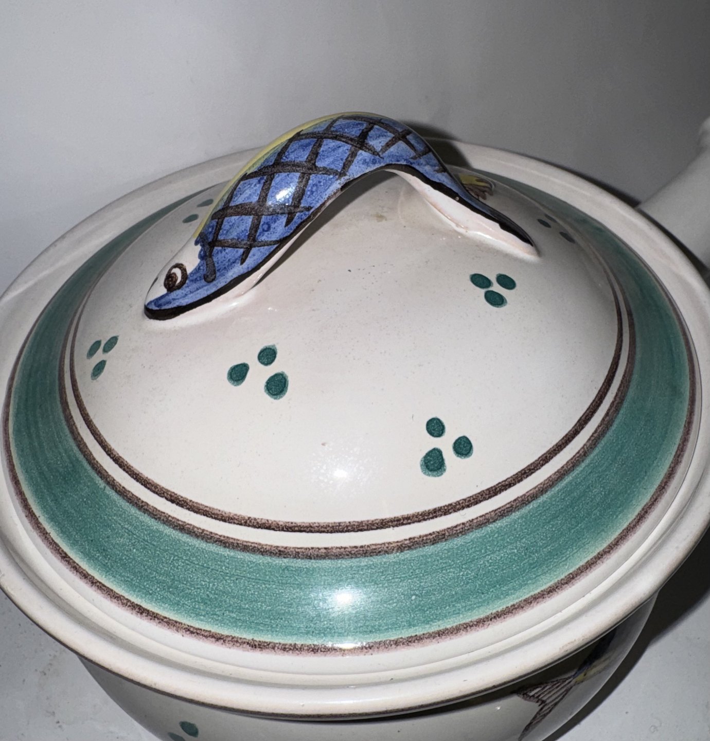 SKÅL TIL JULESILD, påskesild og hverdagssild - Skål med låg og håndtag i keramik fra Lars Syberg keramik værksted. Dekoreret med bemalede sild og figur af sild som lågknop. Fabriksmærket på bunden. Mål: H. 13 cm L. 23,5 cm d. 16,8 cm
