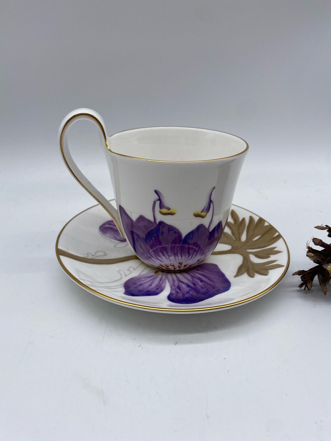 Text zugänglich auf Dänische: Royal Copenhagen Flora højhanket kop med underkop, motiv med stedmorblomst. Nr. 093 -094. 27cl. 1. sort. Hel og fin stand. Pris 350kr.