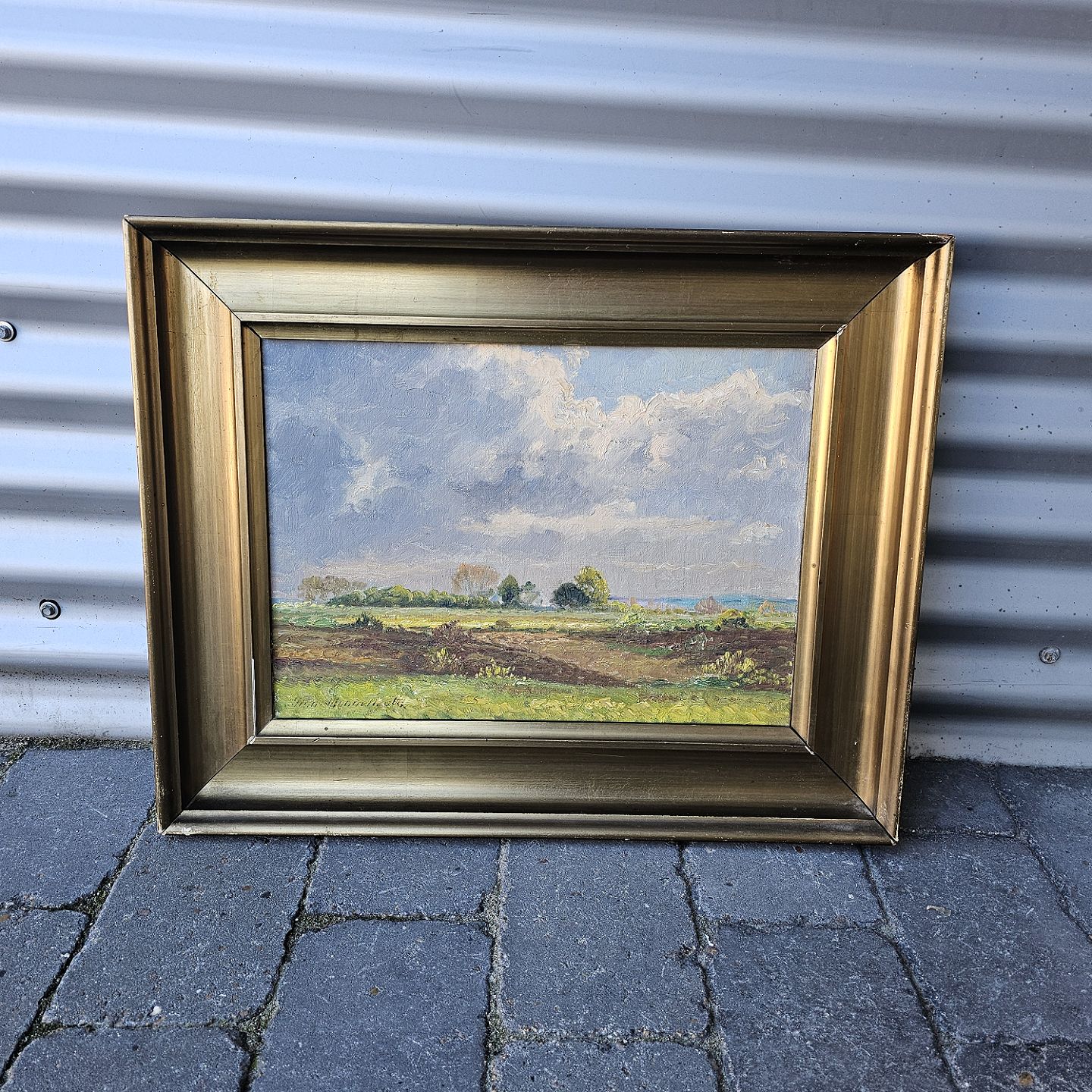 Oliemaleri på lærred med motiv af mark og himmel monteret i guldmalet træramme