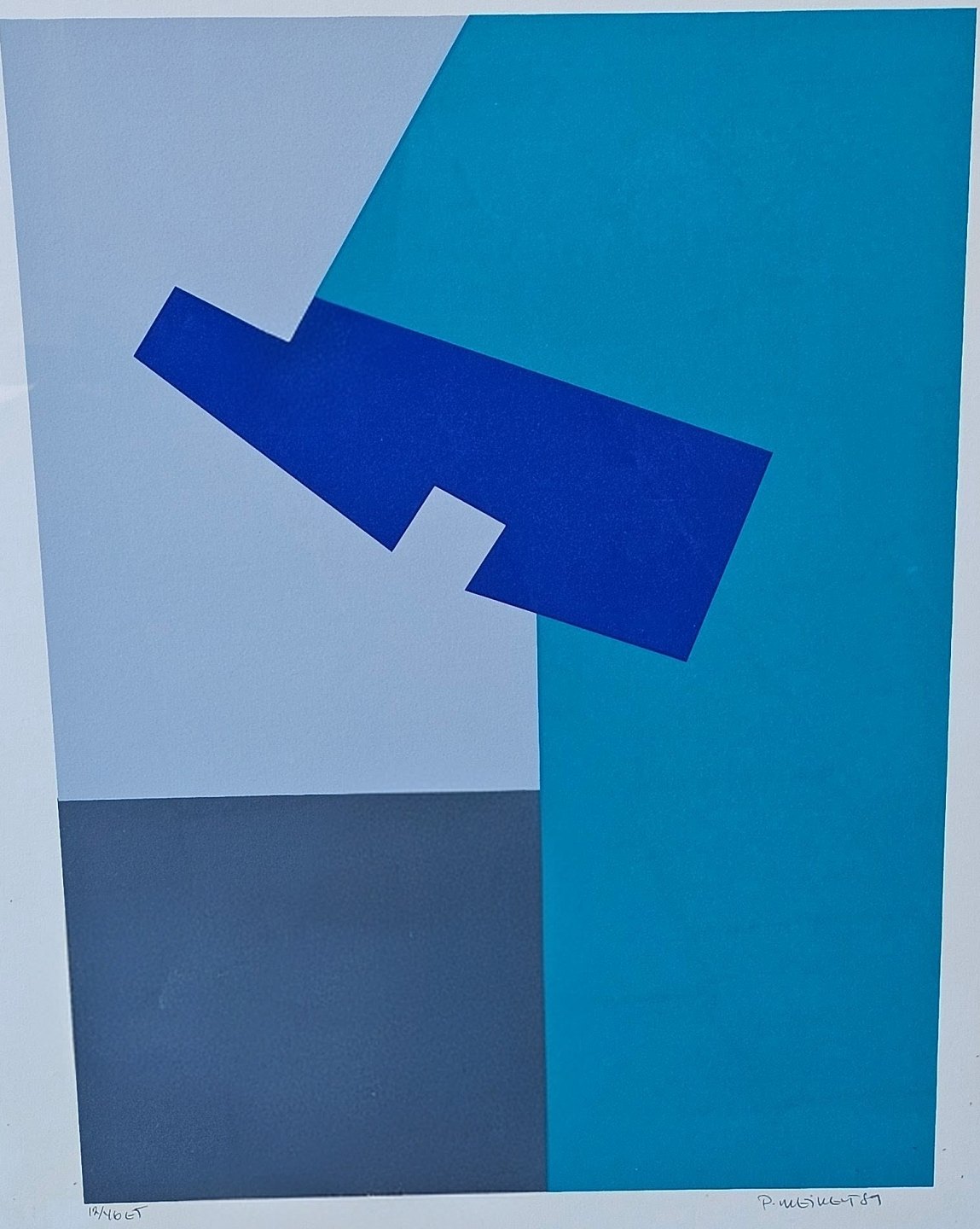 Litografi med abstrakt motiv i blå, turkis og grå monteret i metalramme. Nr. 12/46 og dateret 1989