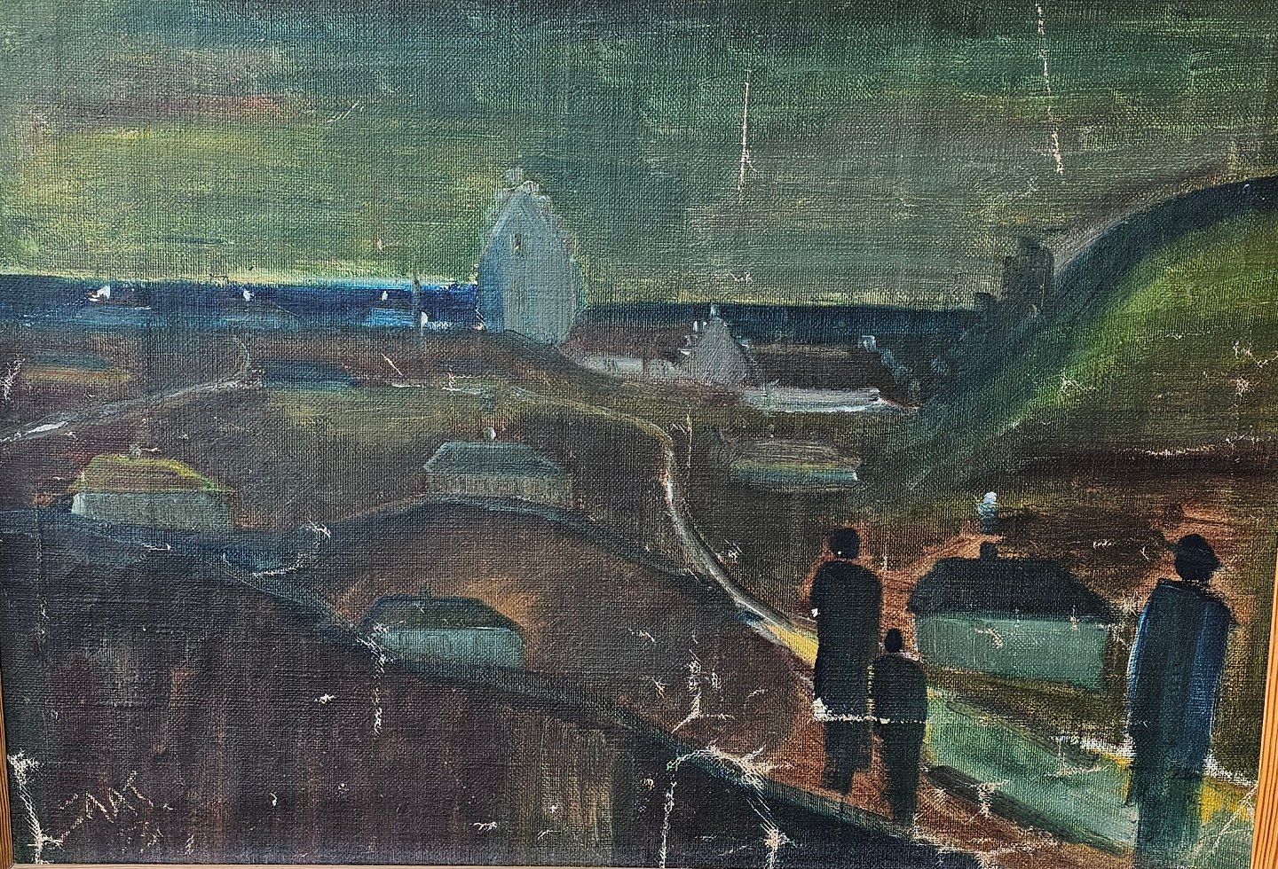 Oliemaleri på lærred med motiv af en kirke i et landsby landskab. Monteret i træramme