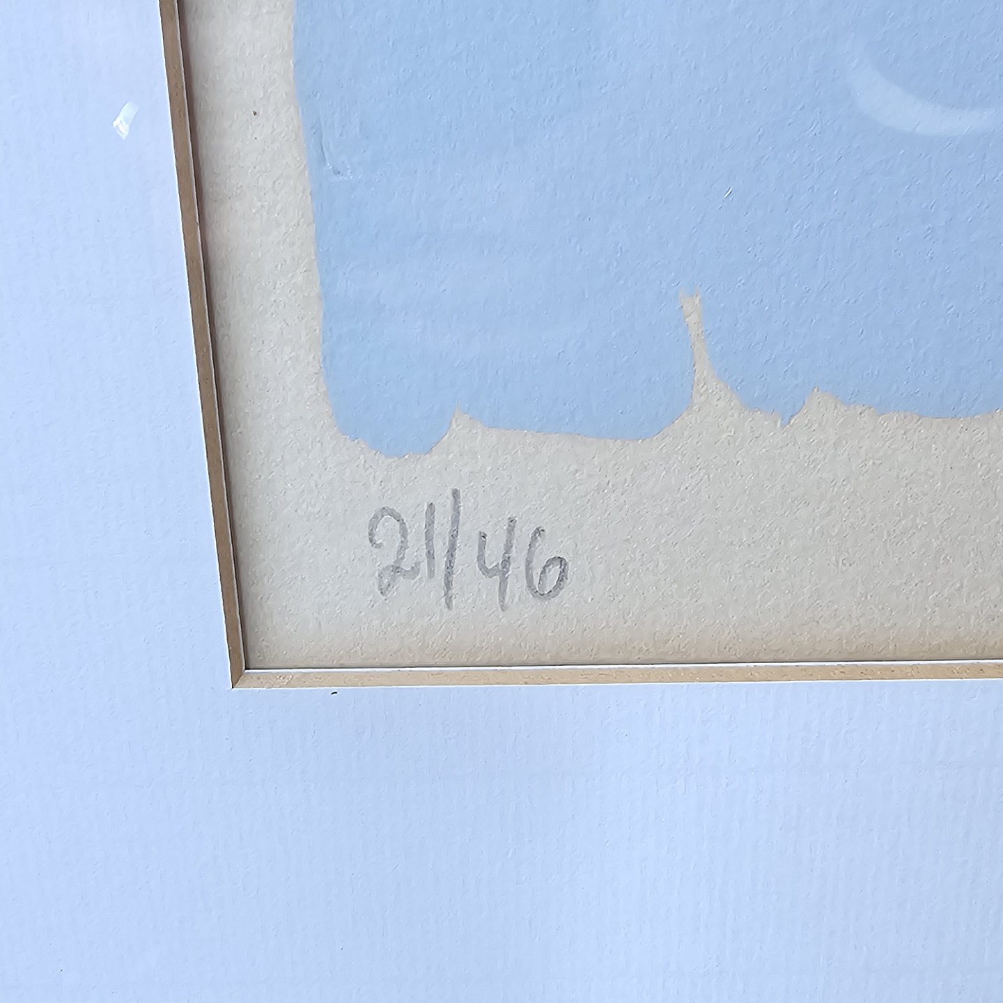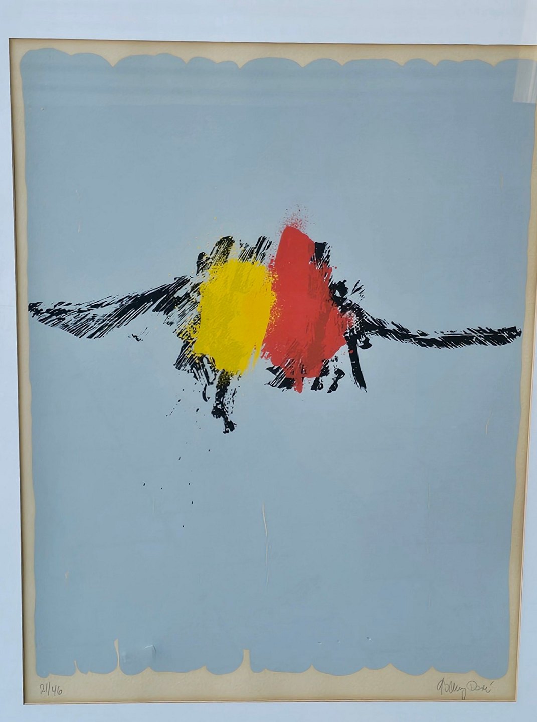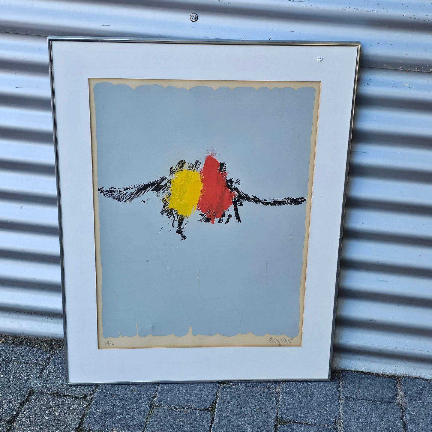Litografi på papir med abstrakt motiv i sort, gul og rød monteret i sølv ramme