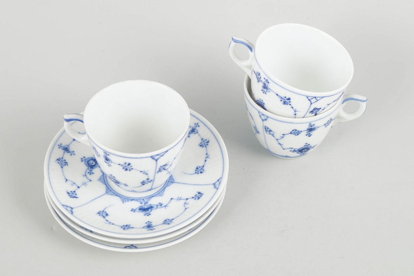 Tre kaffekopper med tilhørende underkopper i porcelæn med håndmalet dekoration i underglasurblå i det klassiske Musselmalet Riflet mønster. Model 1/80. Første sortering.