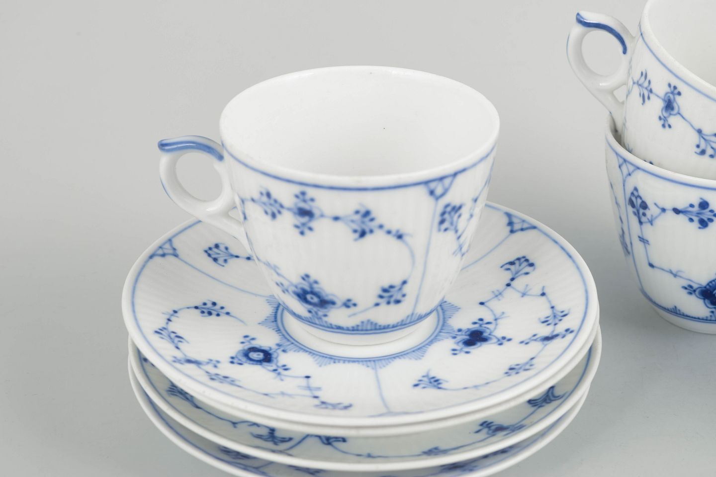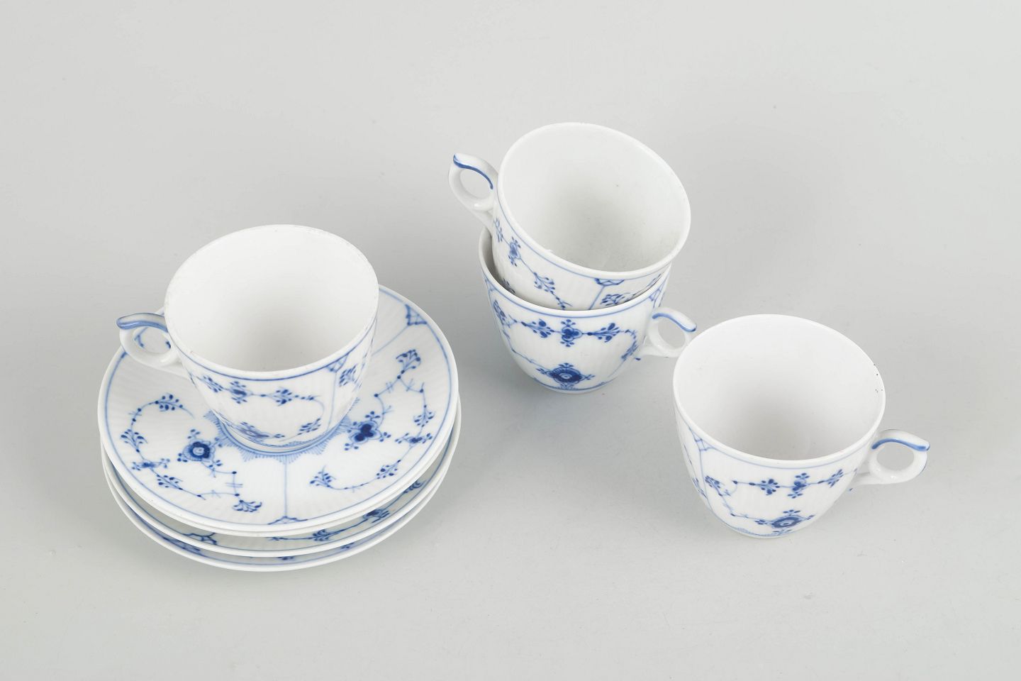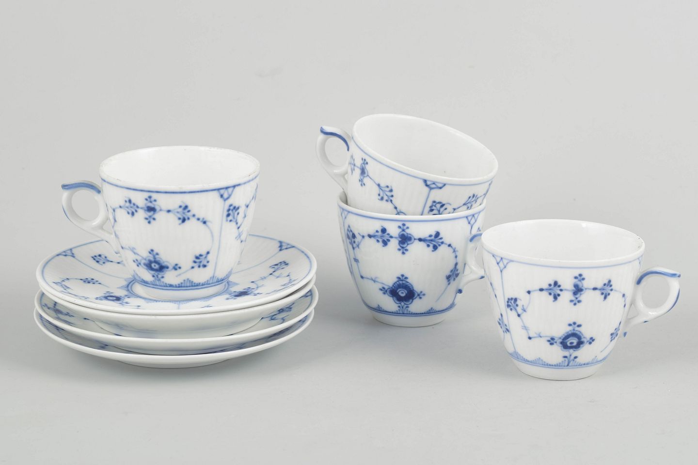 Fire kaffekopper med tilhørende underkopper i porcelæn med håndmalet dekoration i underglasurblå i det klassiske Musselmalet Riflet mønster. Model 1/80. Første og anden sortering.