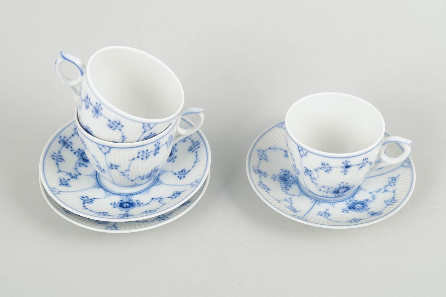 Text zugänglich auf Dänische: Royal Copenhagen Musselmalet Riflet kaffekopper med underkopper, sæt af tre.