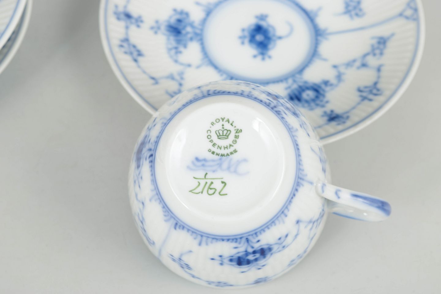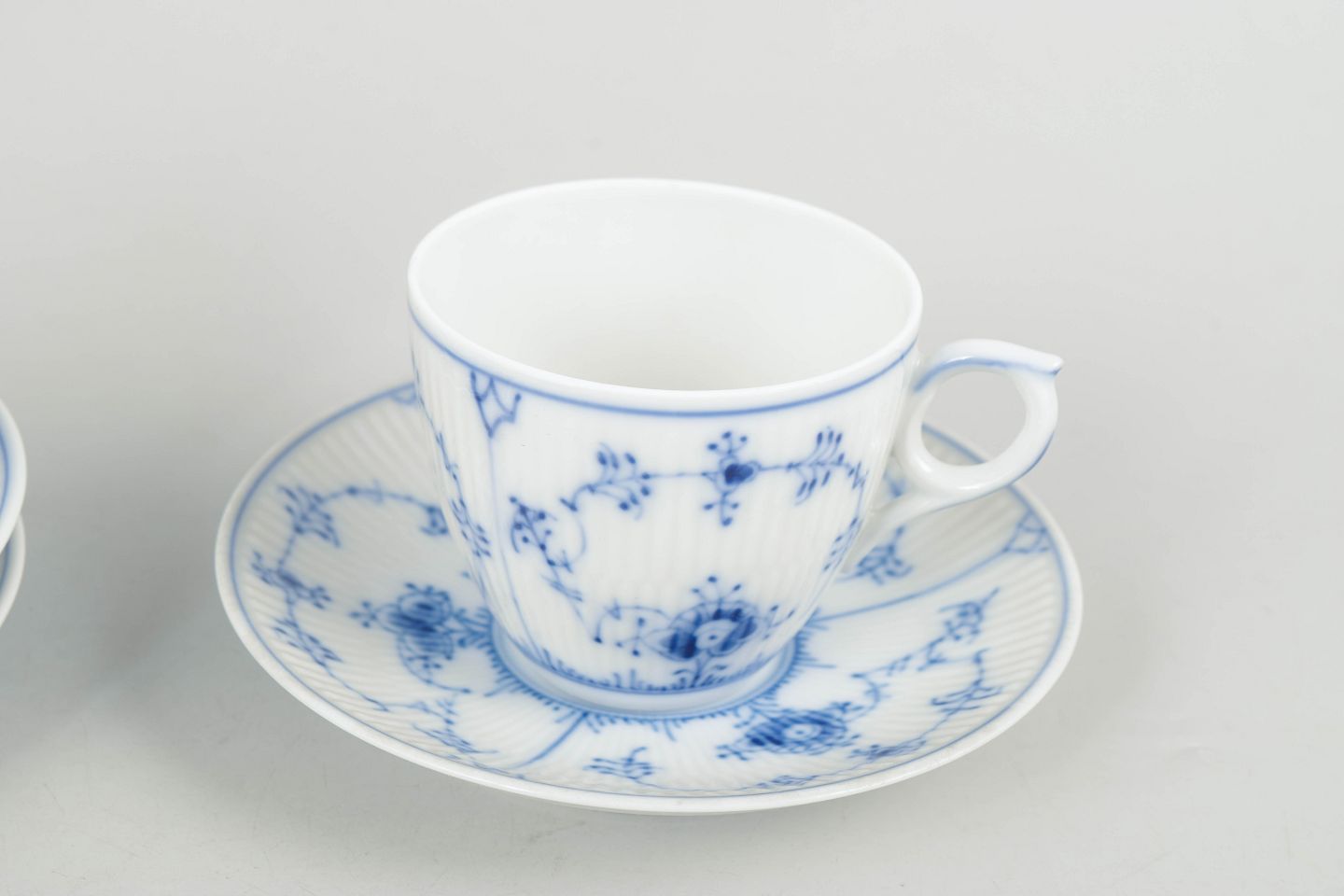 Kaffekopper med tilhørende underkopper i porcelæn med håndmalet dekoration i underglasurblå i det klassiske Musselmalet Riflet mønster. Model 1/2162. Første sortering.