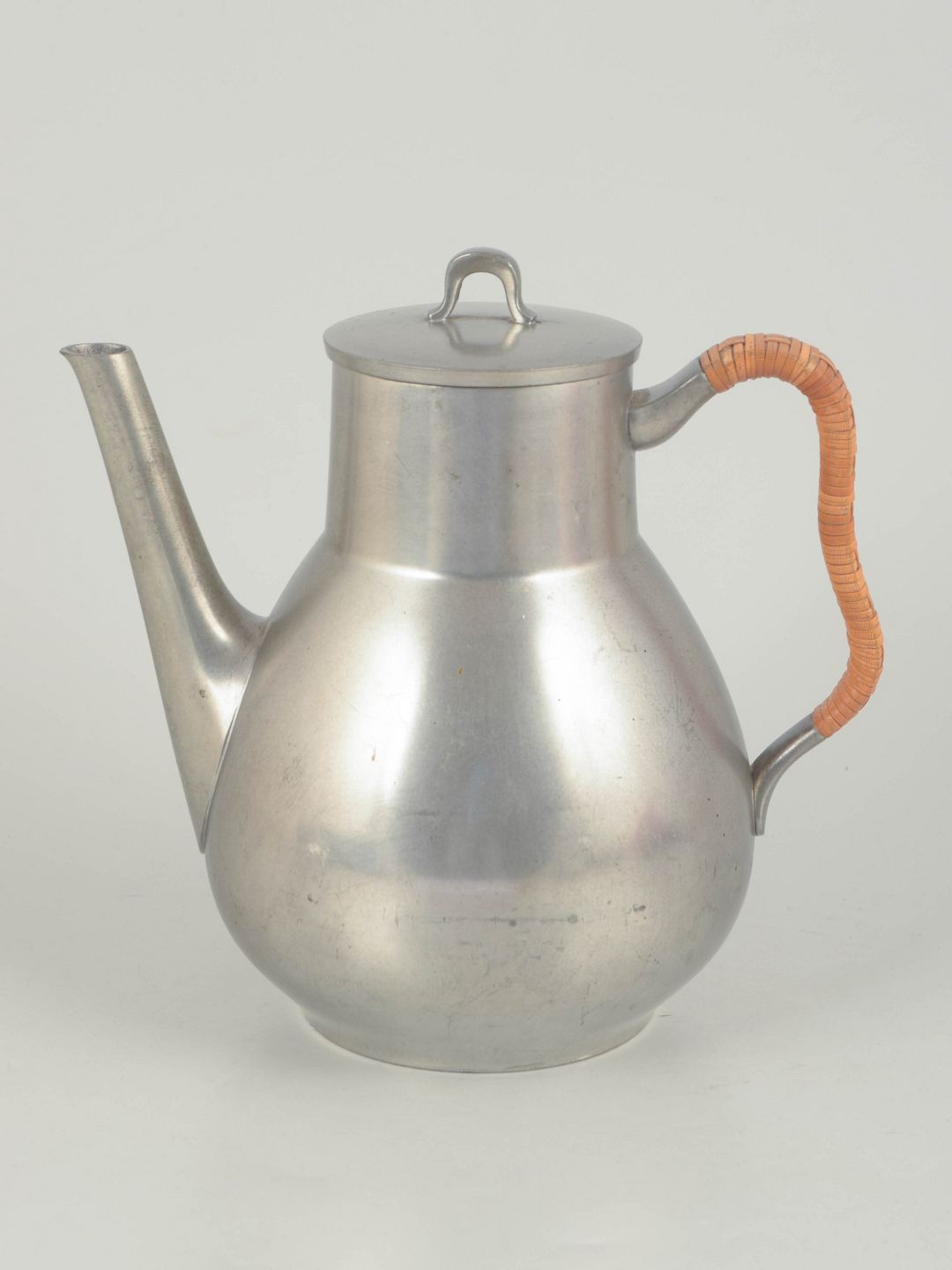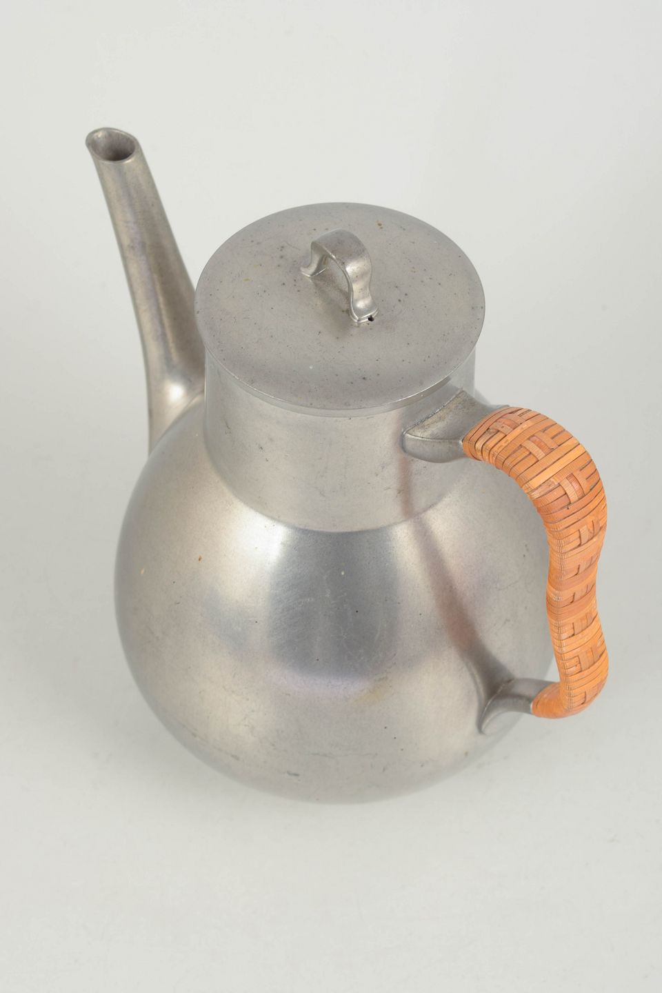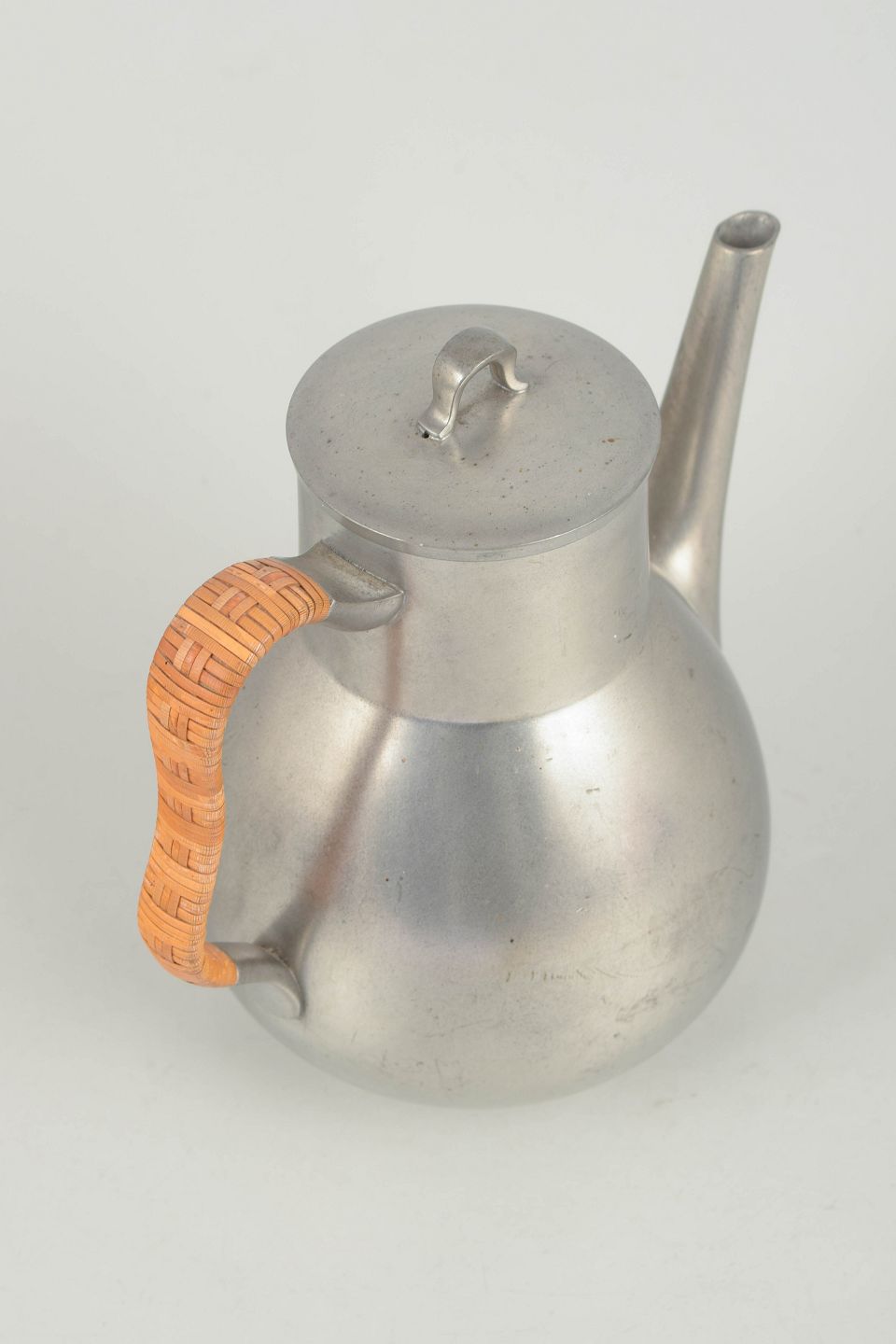 Kaffekande i tin med flettet hank og elegant, afrundet korpus udført i et stilrent art deco formsprog. Model 2661.