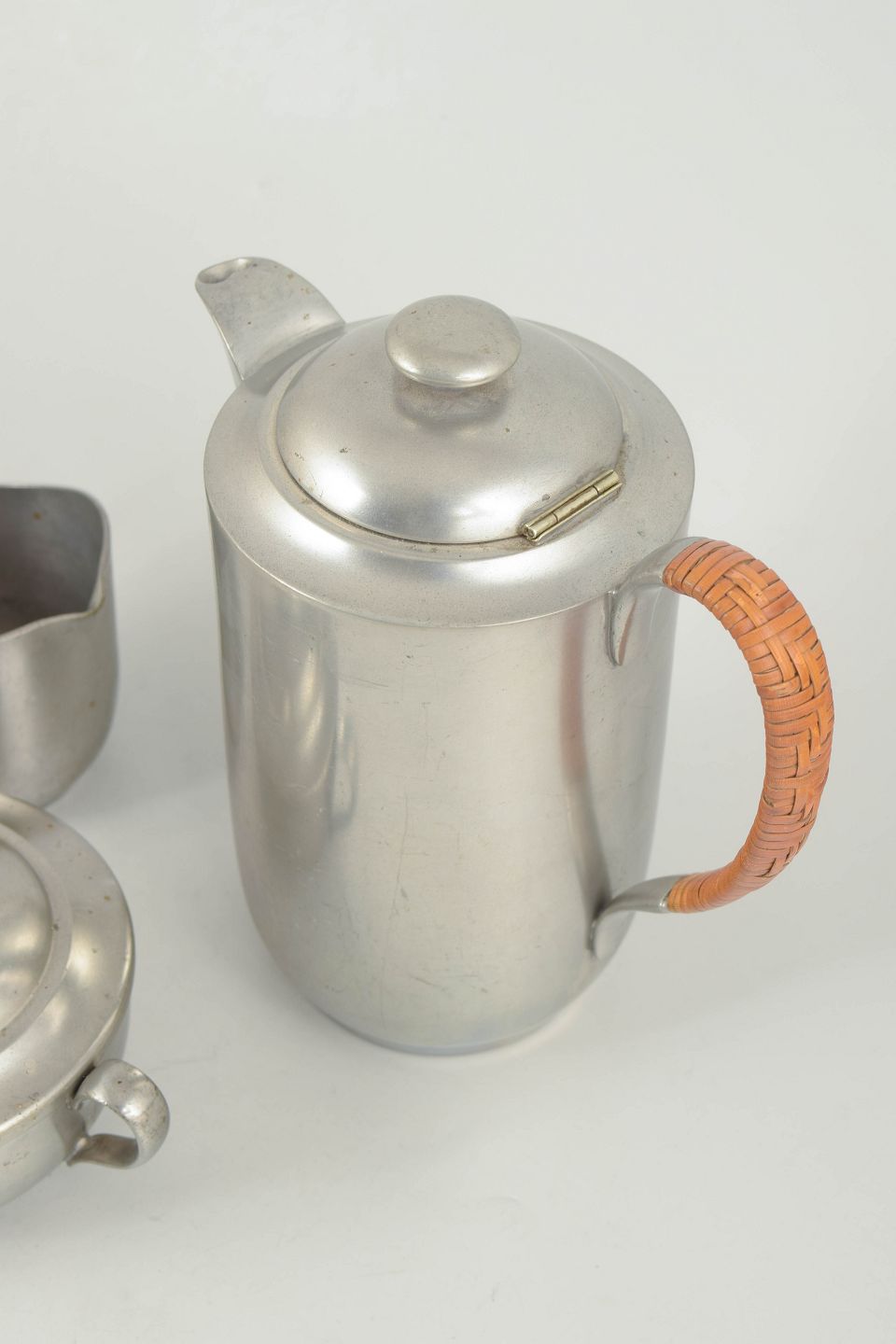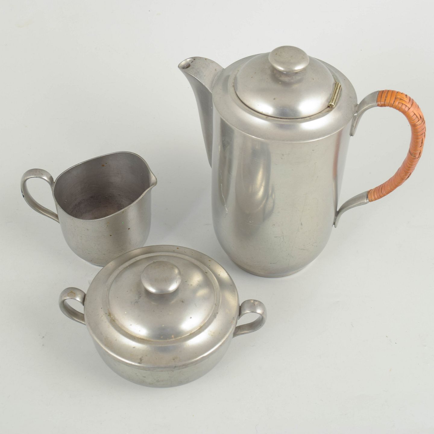 Kaffesæt i tin udført i art deco stil, bestående af kaffekande med flettet hank, flødekande og sukkerskål med låg. Kaffekande model 1303. Flødekande model 1560. Sukkerskål model 1560B.