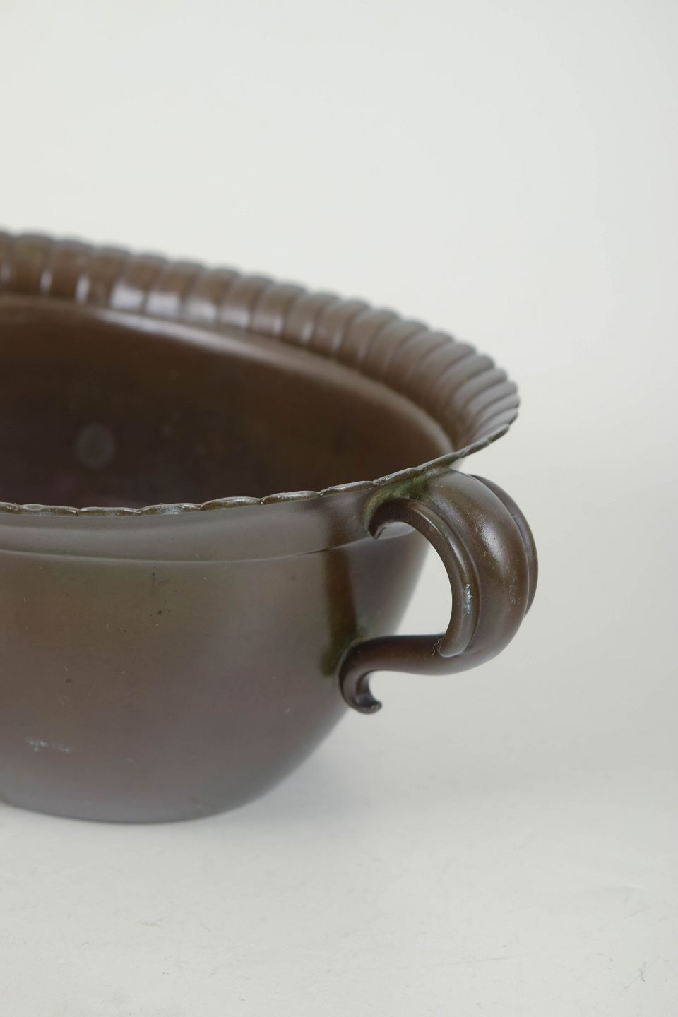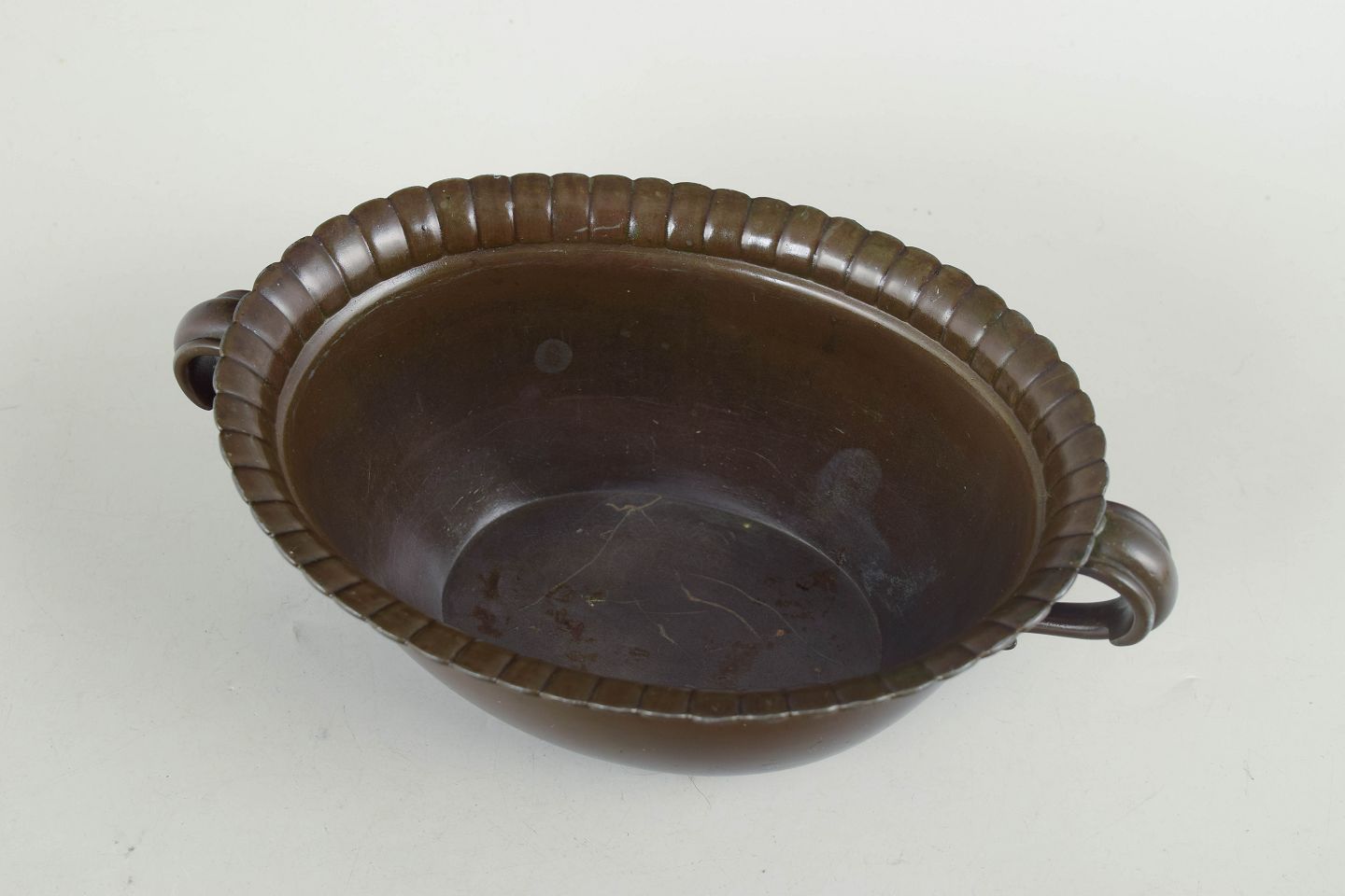 Skål i diskometal med to svungne hanke og riflet kant, udført i et karakteristisk art deco formsprog. Model 1819A.