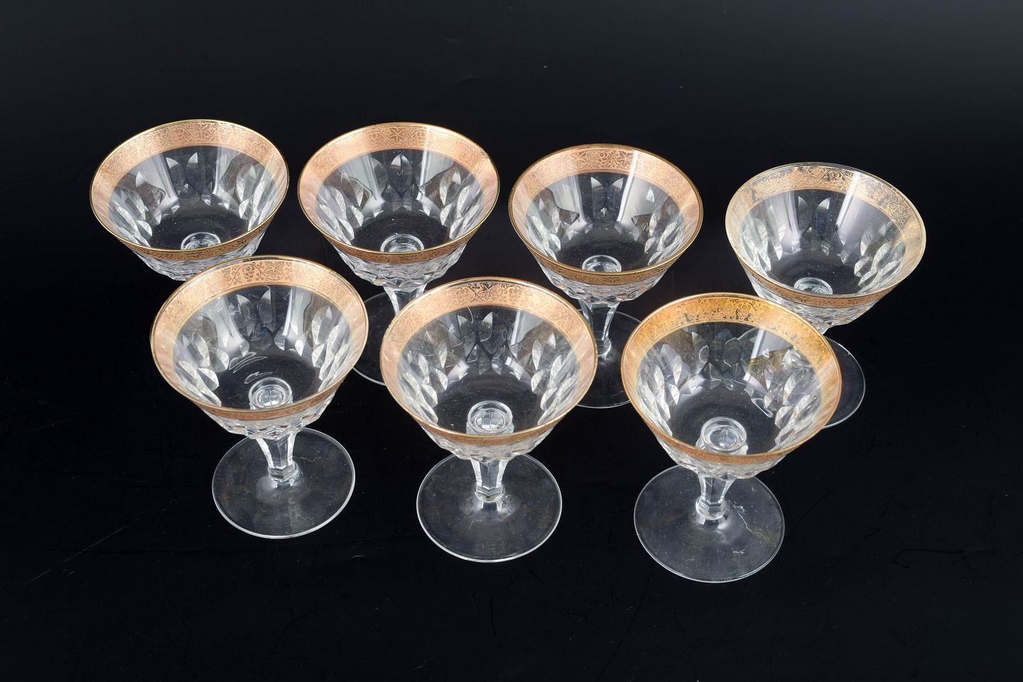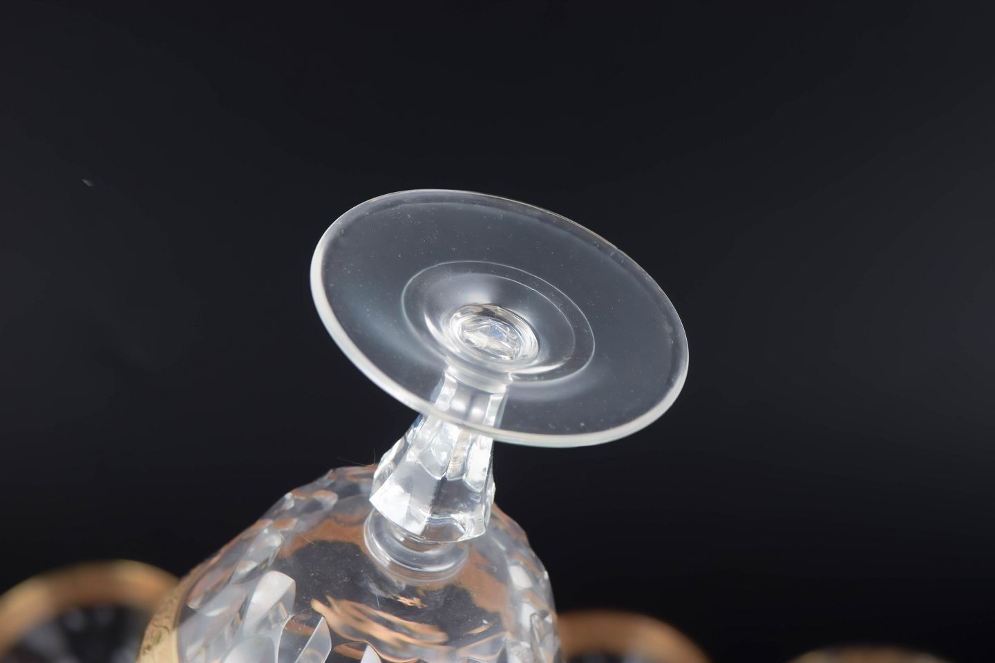 Elegante likørglas i facetslebet krystal med dekoration i 24 karat guld langs kanten, udført i klassisk midten af det 20. århundrede stil.