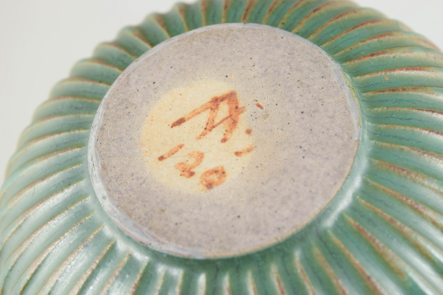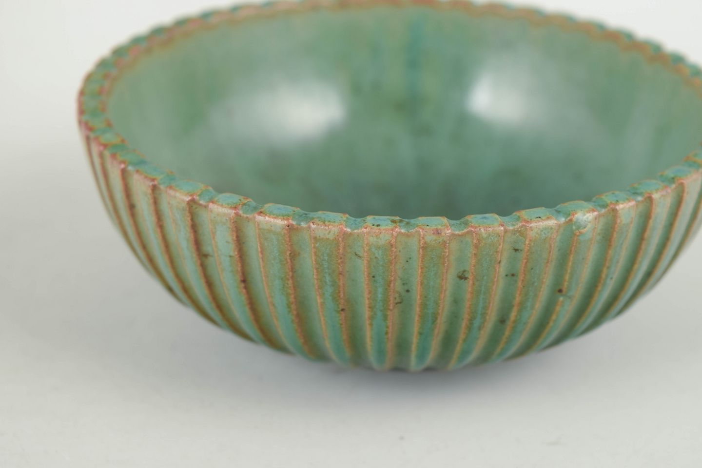 Lav skål i stentøj med riflet korpus og grønlig glasur med fine nuancer. Model 120.