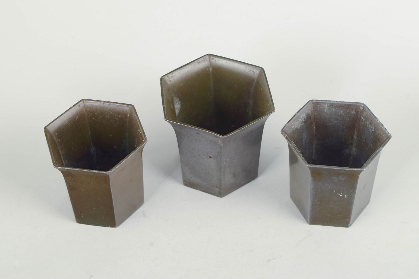 Tre små vaser i diskometal med sekskantet korpus og stilrent art deco formsprog. Modeller D22 og D23.