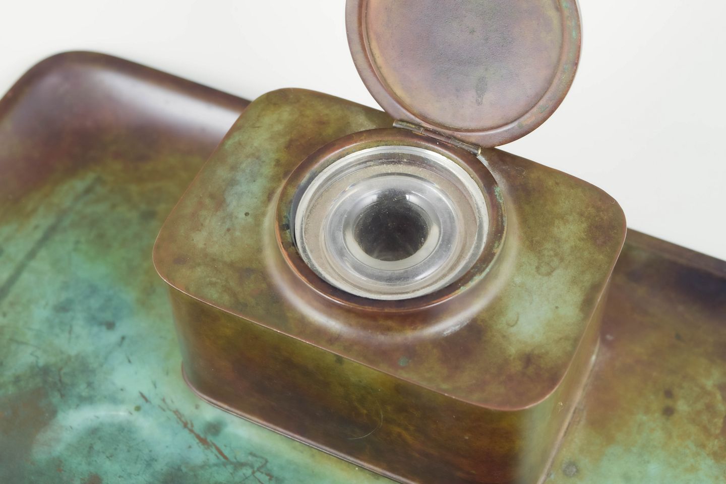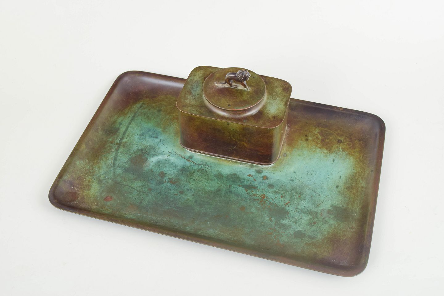 Blækhus i legeret bronze med rektangulær bakke, kvadratisk beholder med låg og original glasindsats. Model LB 1820.