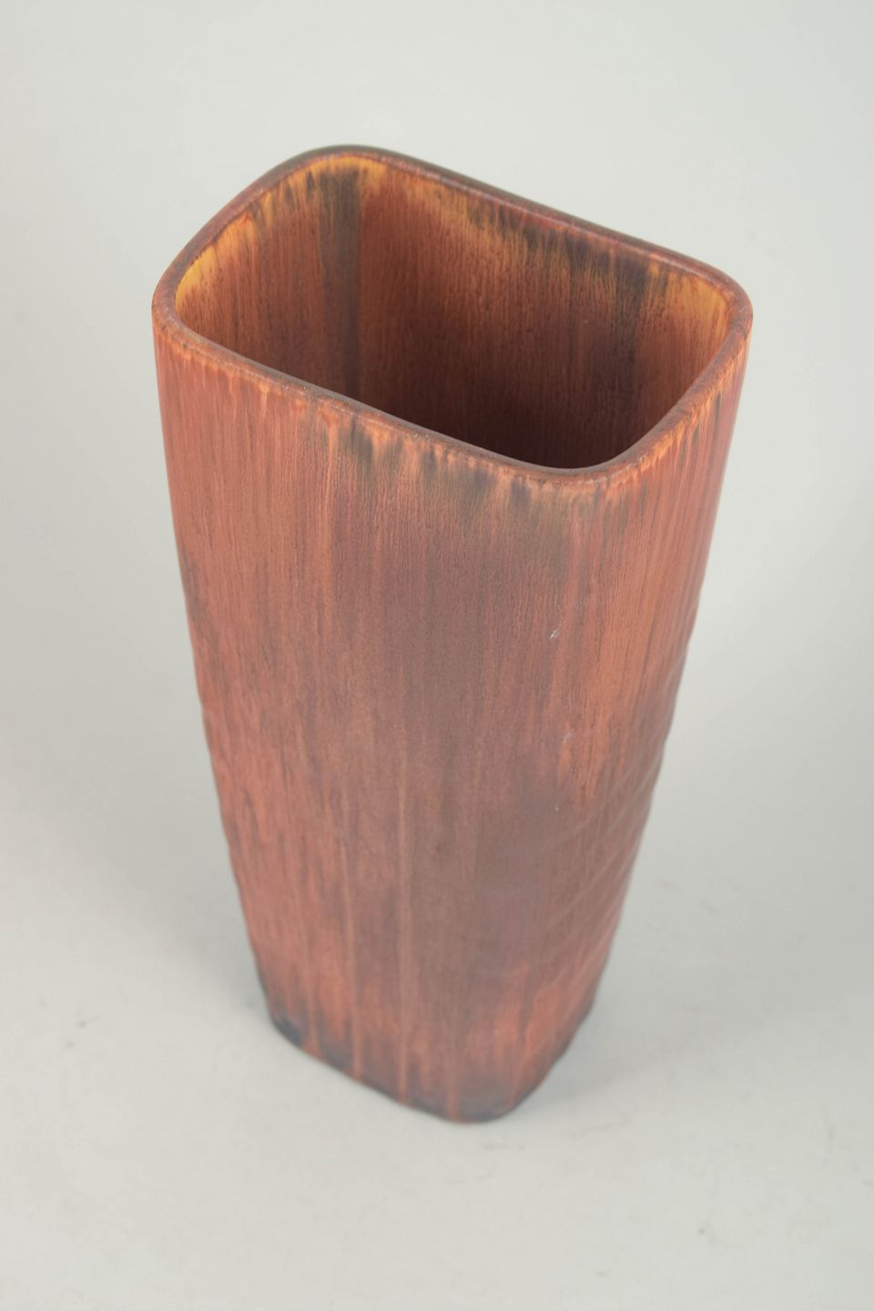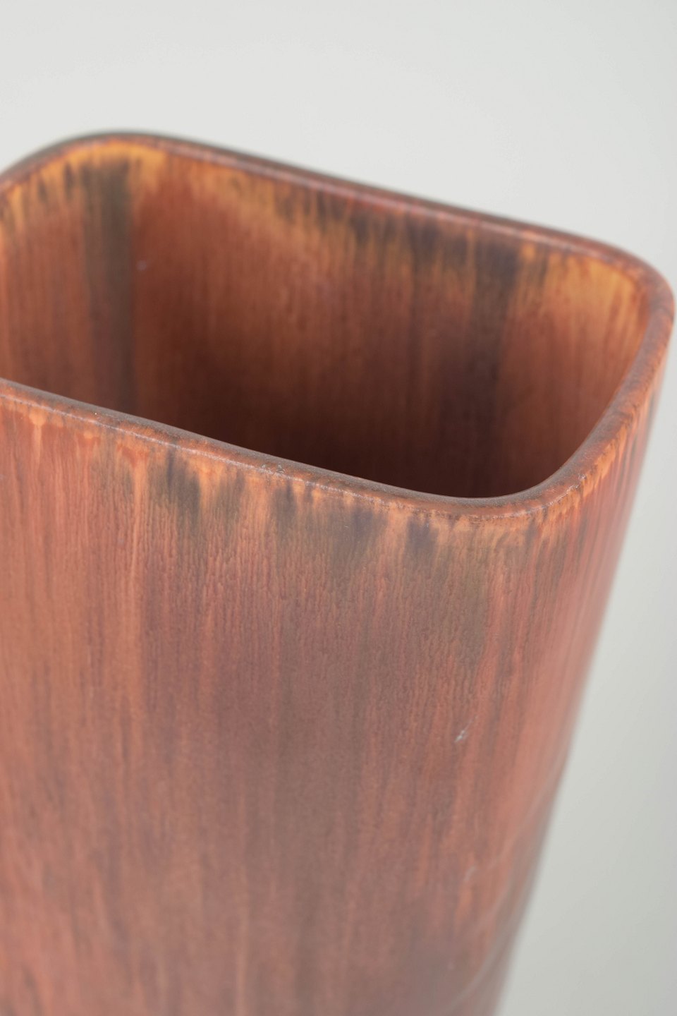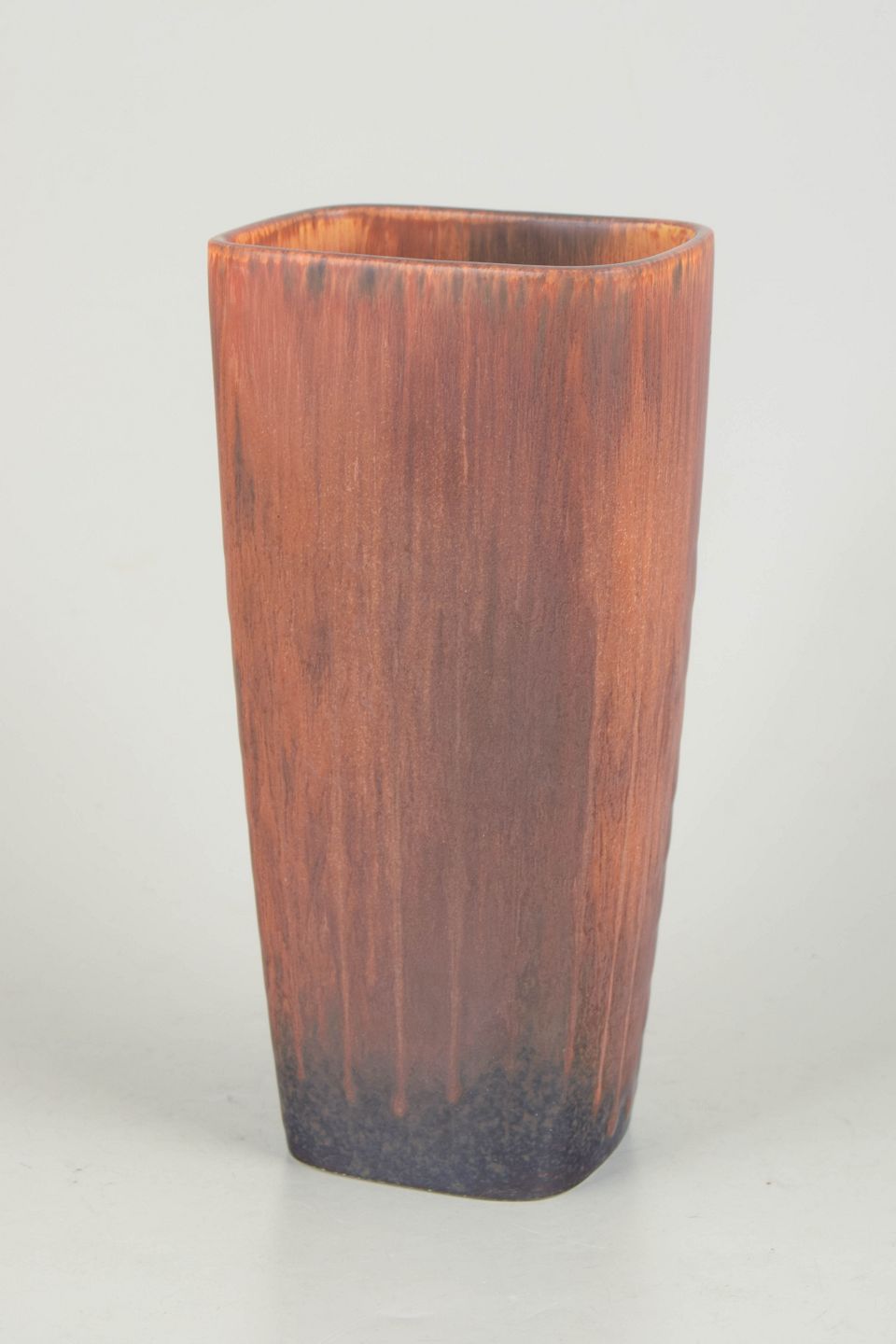 Stor, kantet vase i stentøj med markant rektangulær form og afrundede hjørner. Dekoreret med løbende glasur i varme brunlige og kobbertoner, der samler sig i mørkere nuancer mod bunden. Et kraftfuldt og dekorativt eksempel på Stålhane’s arbejde i større formater.