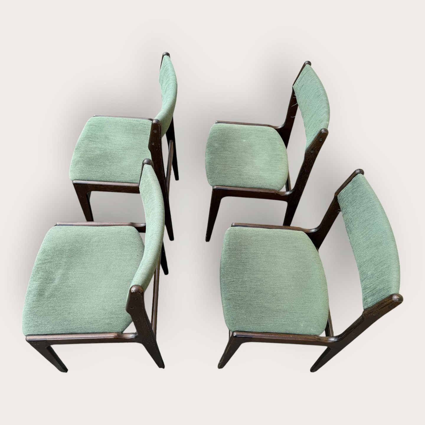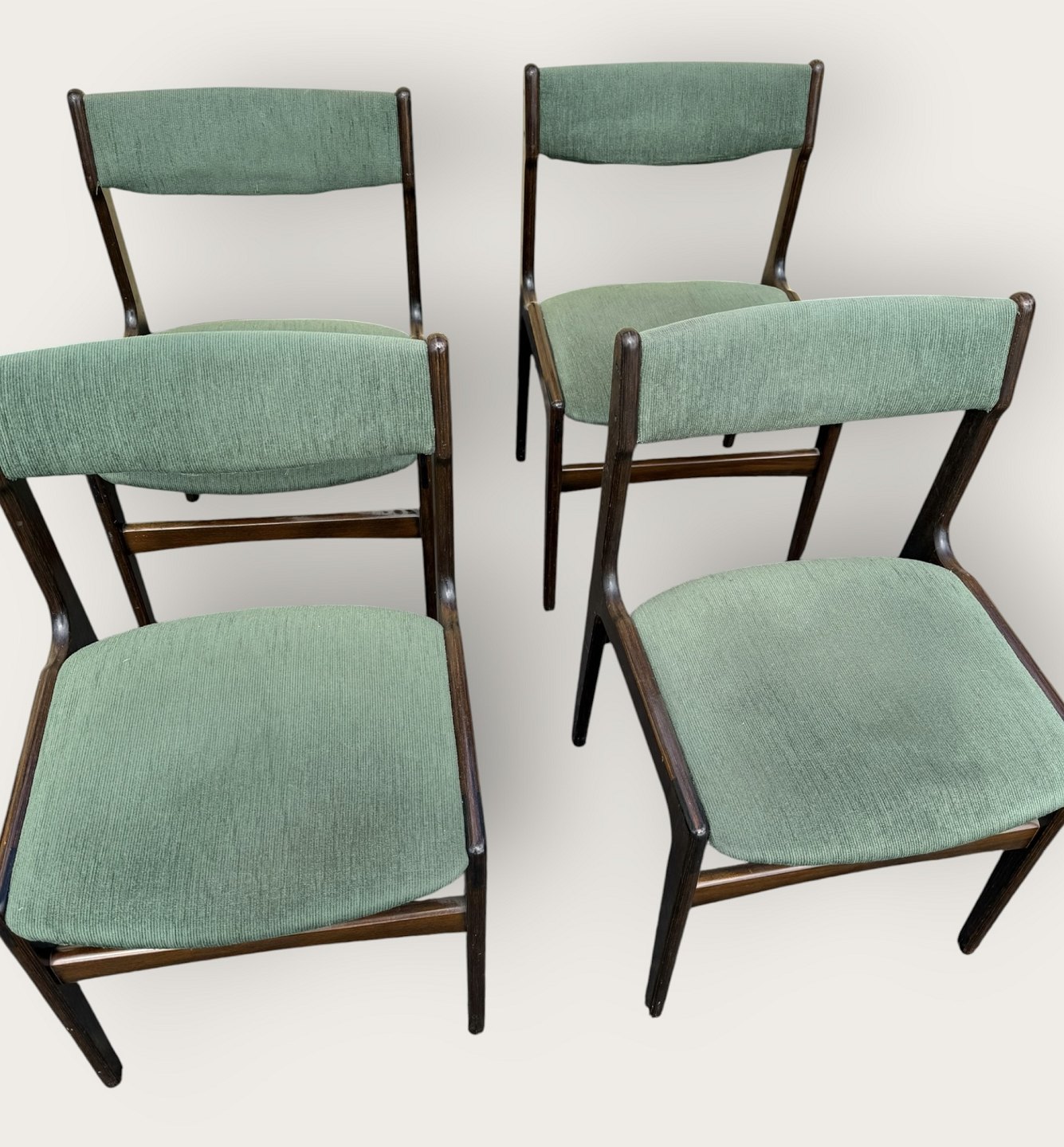 4 Stühle aus dunkel gebeiztem Holz, dänisch modern aus den 1960er Jahren, die Stühle sind stabil und in gutem gebrauchten Zustand, aber der Bezug ist fleckig/locker.