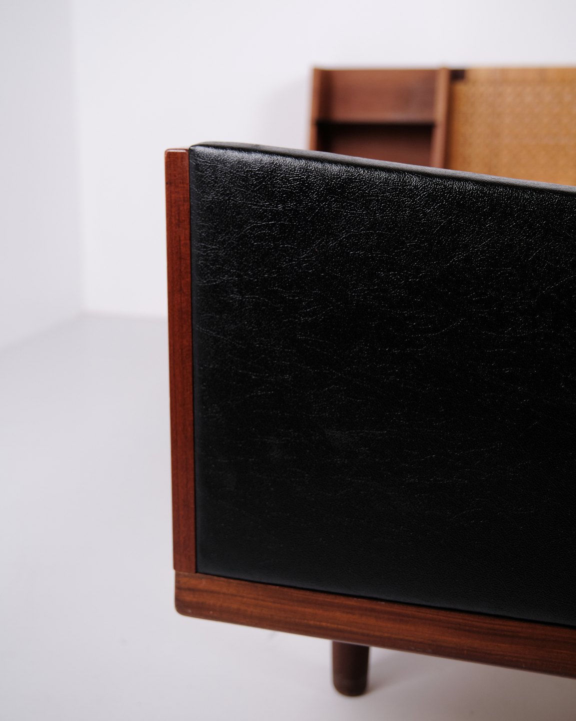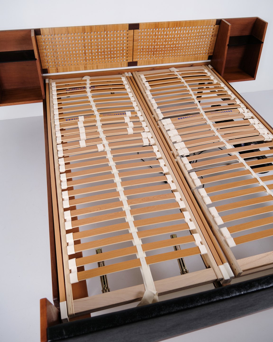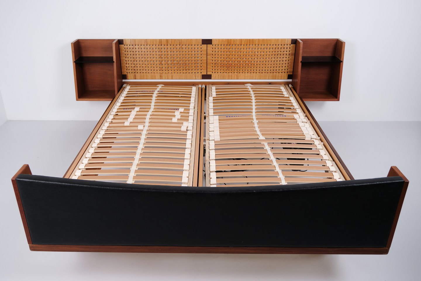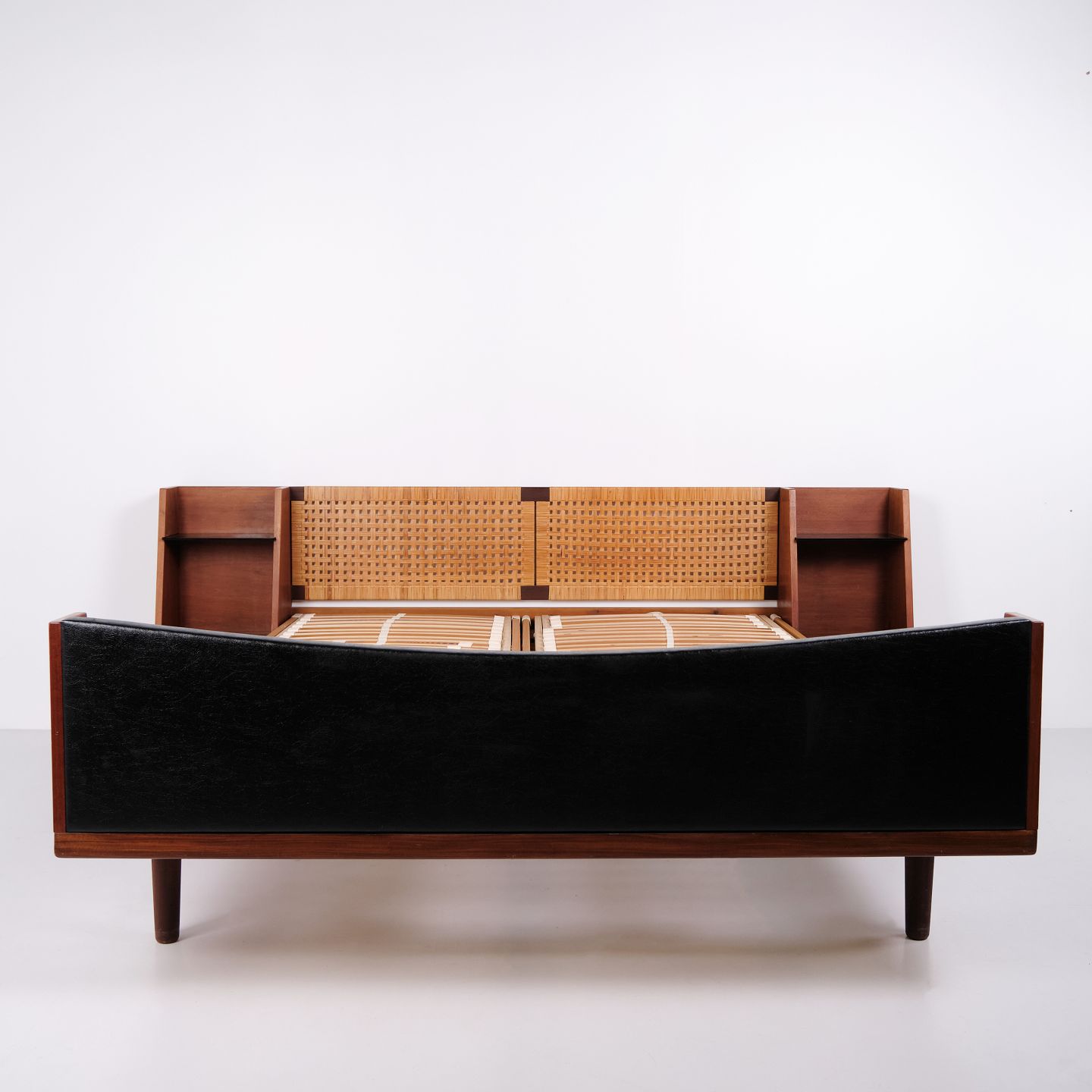 Doppelbett Modell GE 701, entworfen von Hans J. Wegner und hergestellt von Getama in den 1950er Jahren. Gefertigt aus furniertem und massivem Teakholz. Kopf- und Fußteil mit Geflecht und schwarzem Kunstleder. Kopfteil mit integrierten Nachttischen mit schwarzen Glasböden sowie zusätzlicher Ablage darunter. Messingbeschläge. Hans J. Wegner arbeitete viele Jahre mit Getama zusammen und entwarf mehrere Teakmöbel für Wohn- und Schlafbereiche.