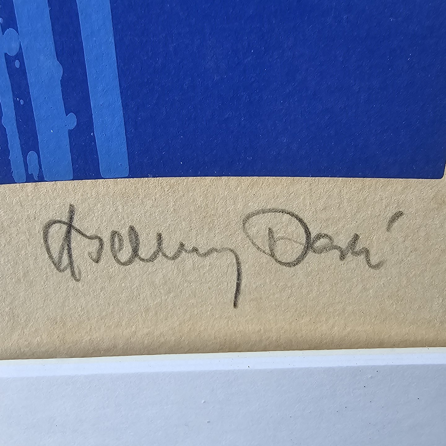 Litografi med abstrakt motiv i sort og blå monteret i sølvramme