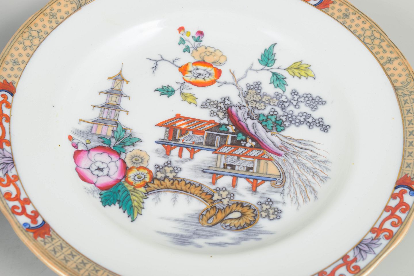 Middagstallerkener i fajance med orientalsk inspireret dekoration i polykrome farver og detaljerig bemaling i japansk stil, karakteristisk for Rörstrands japanismeproduktion fra begyndelsen af 1900-tallet.