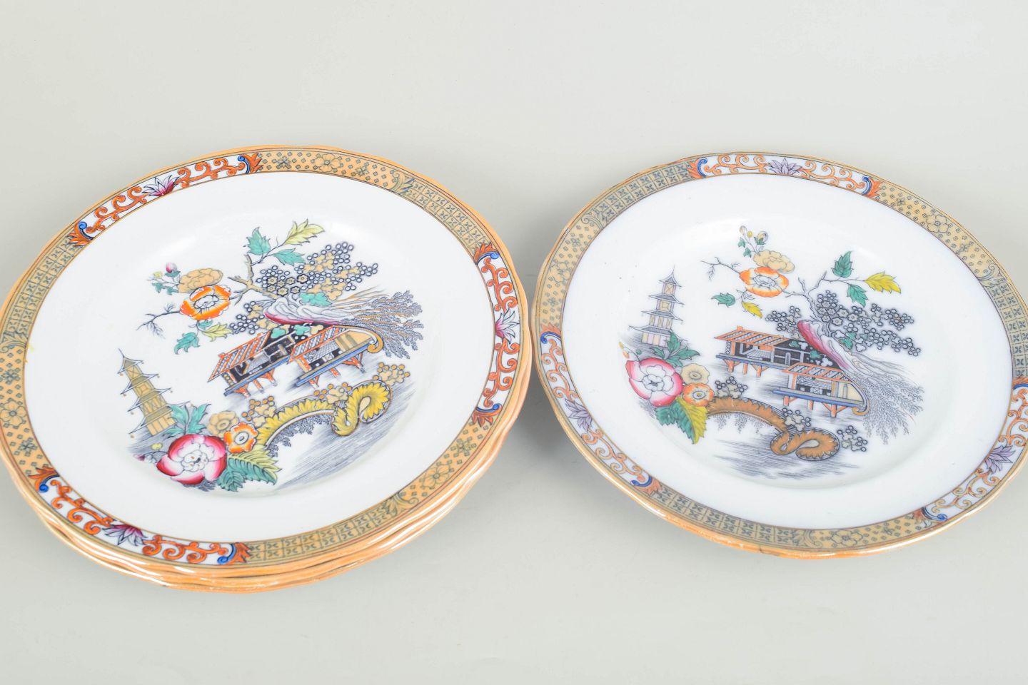 Middagstallerkener i fajance med orientalsk inspireret dekoration i polykrome farver og detaljerig bemaling i japansk stil, karakteristisk for Rörstrands japanismeproduktion fra begyndelsen af 1900-tallet.