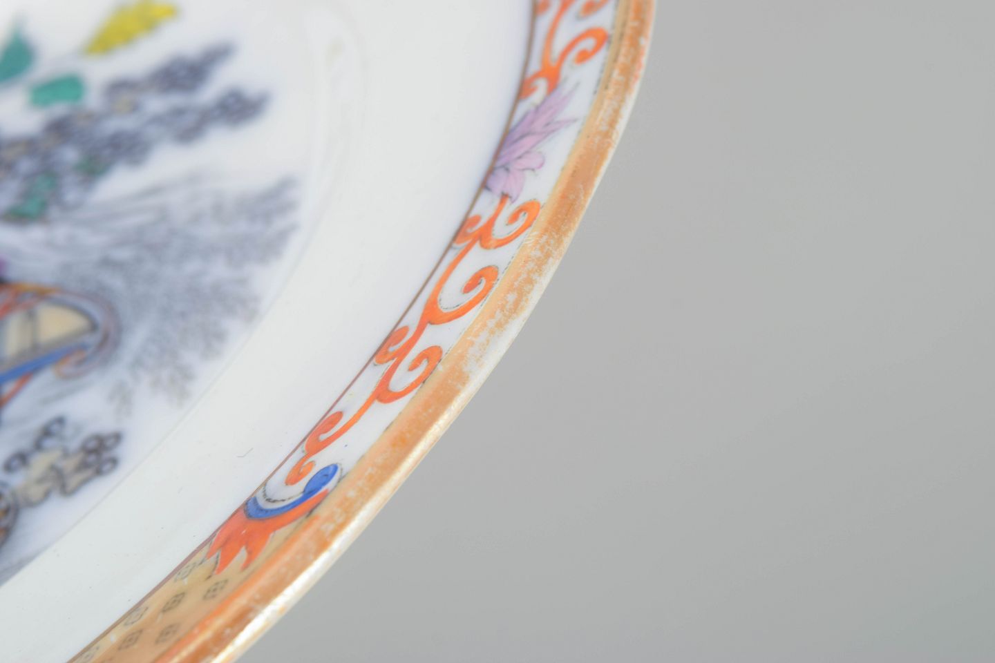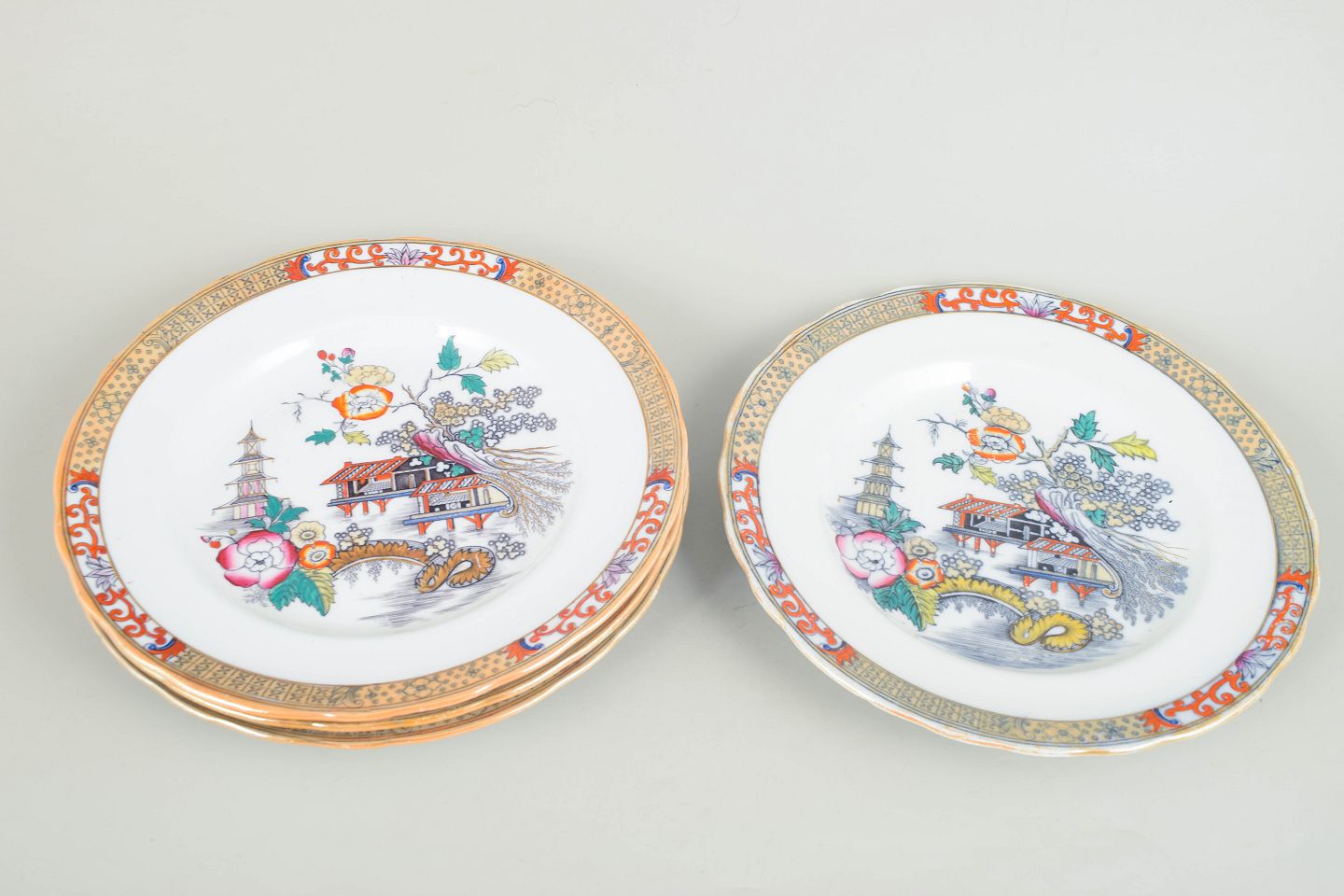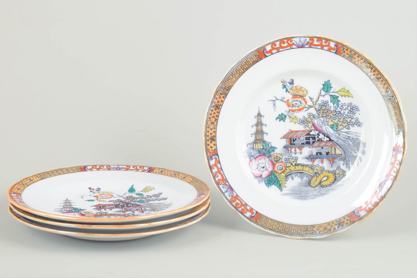 Middagstallerkener i fajance med orientalsk inspireret dekoration i polykrome farver og detaljerig bemaling i japansk stil, karakteristisk for Rörstrands japanismeproduktion fra begyndelsen af 1900-tallet.