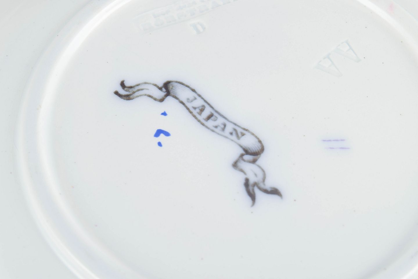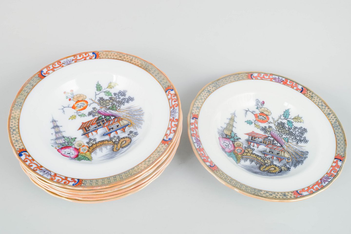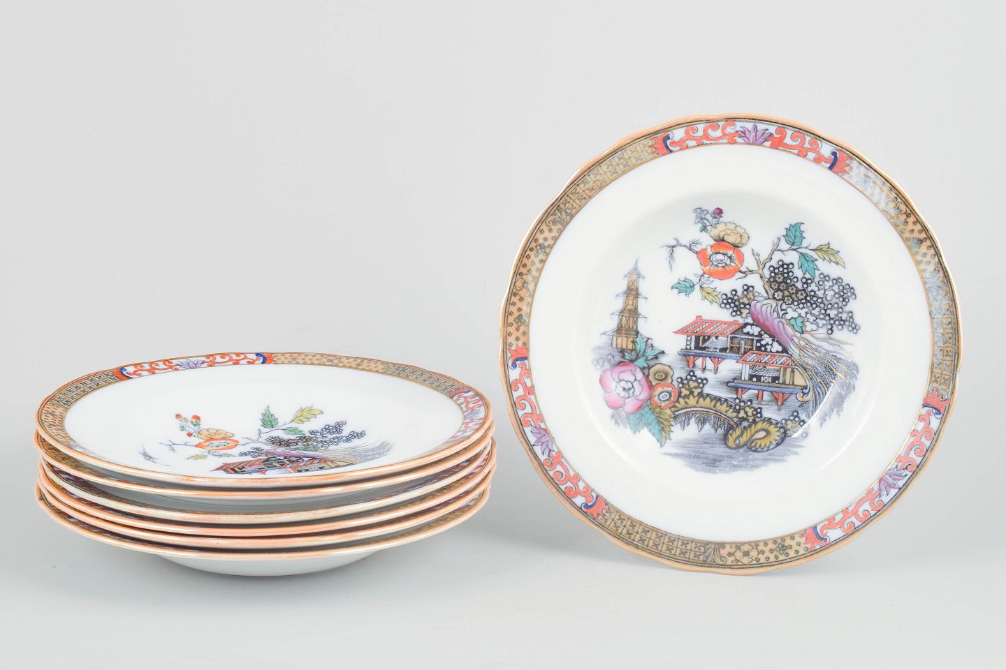 Dybe tallerkener i fajance med orientalsk inspireret dekoration i polykrome farver og detaljerig bemaling i japansk stil, karakteristisk for Rörstrands japanismeproduktion fra begyndelsen af 1900-tallet.