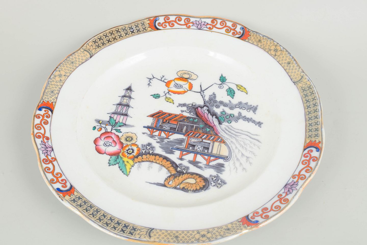 Store runde serveringsfade i fajance med orientalsk inspireret dekoration i polykrome farver og detaljerig bemaling i japansk stil, karakteristisk for Rörstrands japanismeproduktion fra begyndelsen af 1900-tallet.