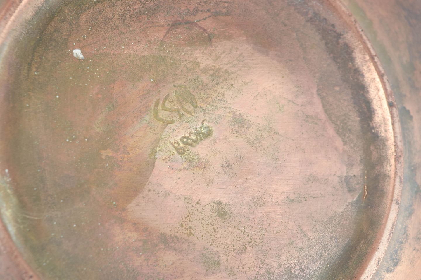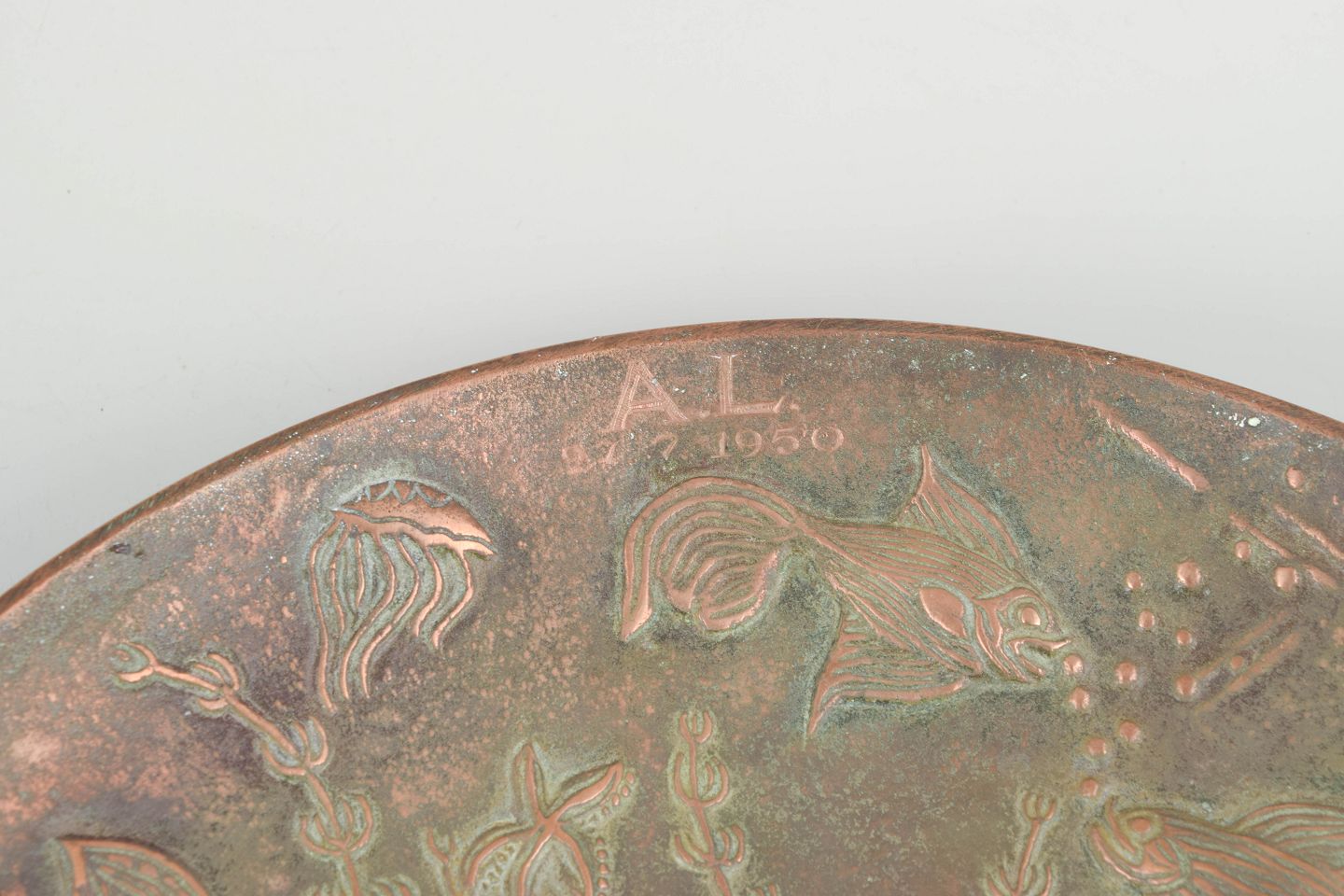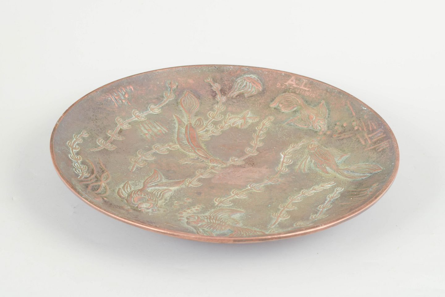 Sjældent cirkulært fad i bronze med reliefdekoration af stiliserede fisk, vandplanter og organiske former, udført med karakteristisk patineret overflade i varme kobber- og grønne nuancer. Med indgraverede initialer fra tidligere ejer.