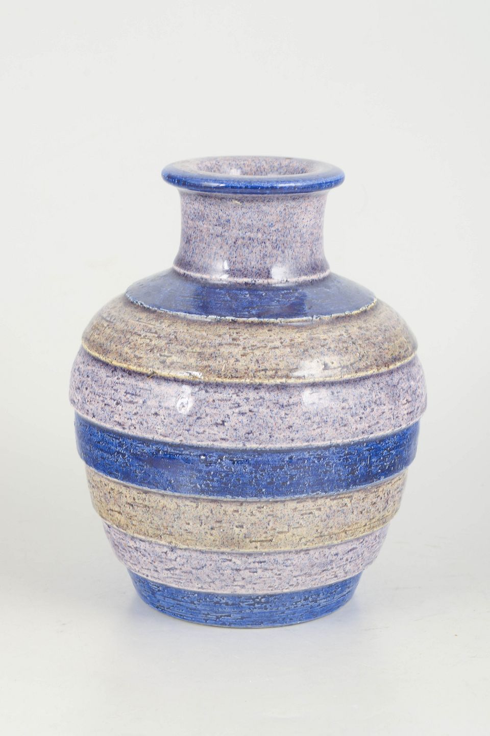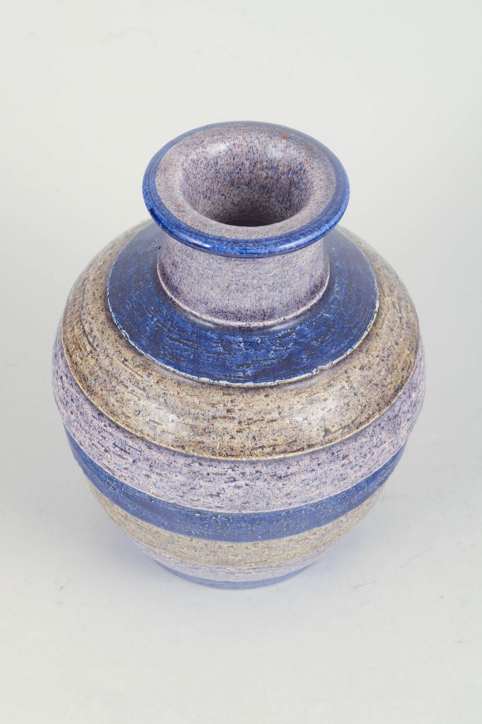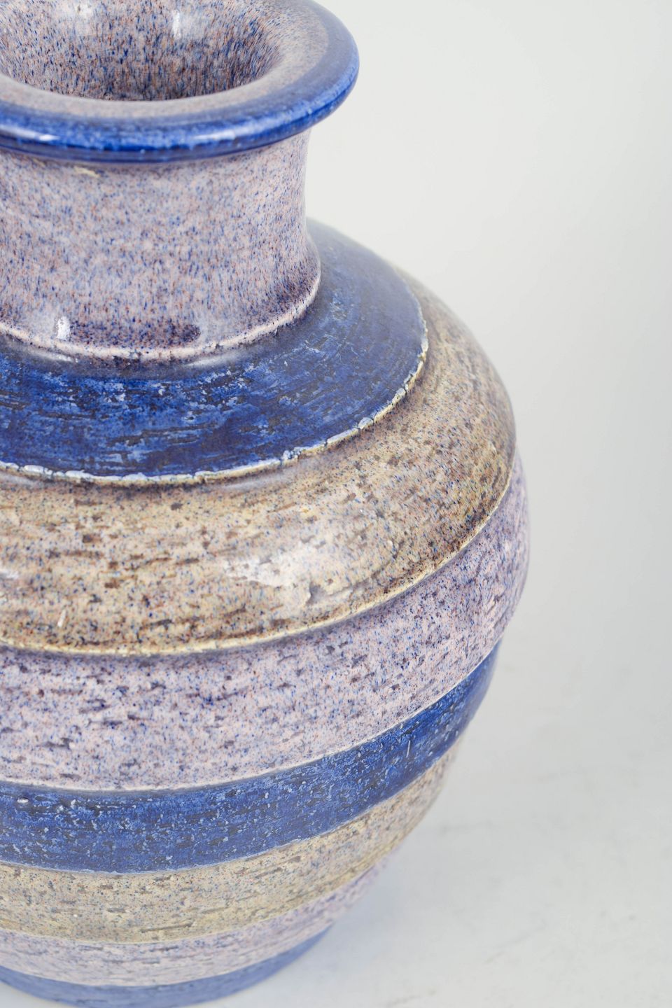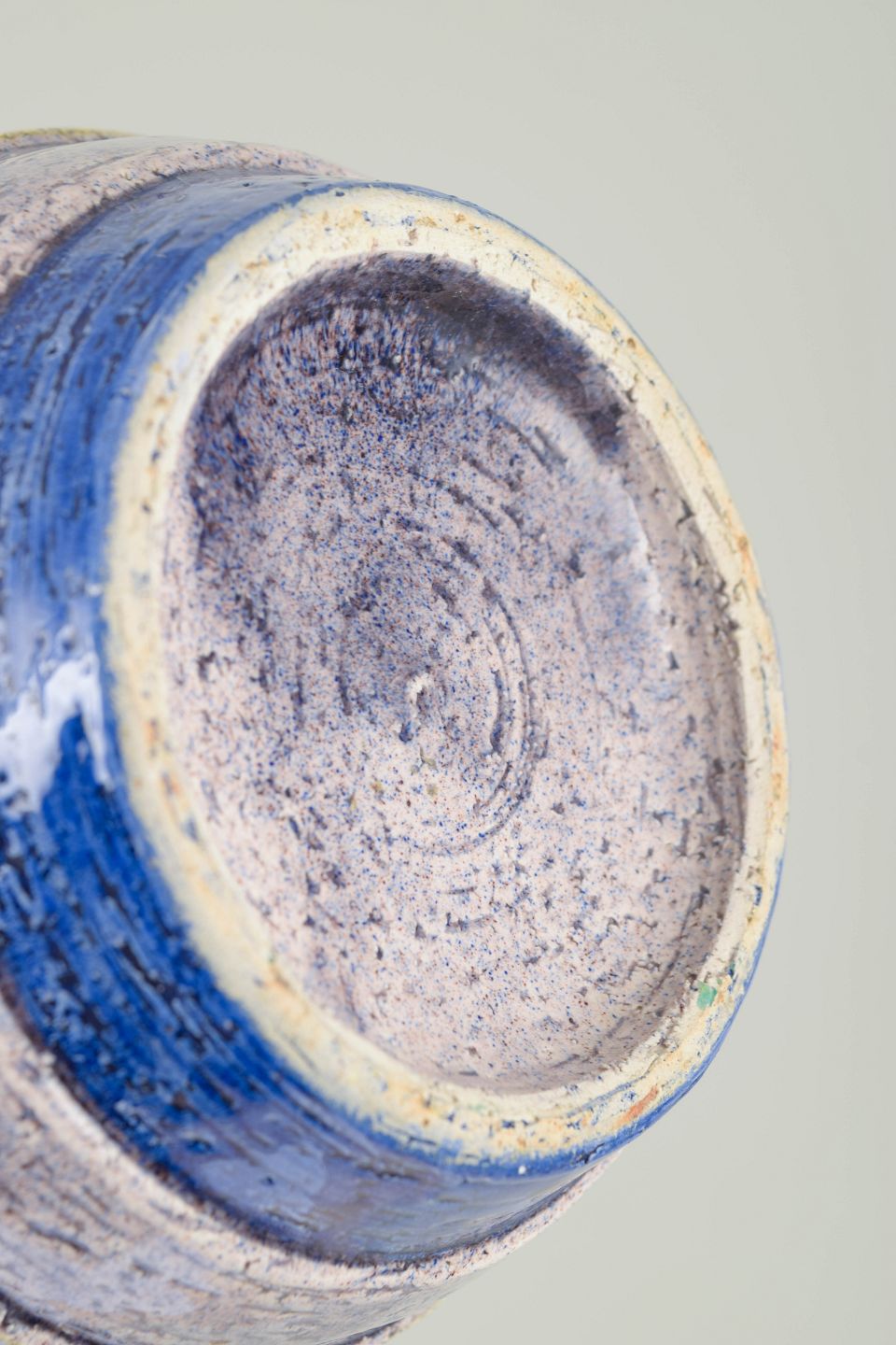 Håndlavet vase i keramik med koncentriske ringe og karakteristisk glasur i blå, creme og sandfarvede nuancer. Udført i 1970’erne i Bitossis velkendte kunstneriske stil.