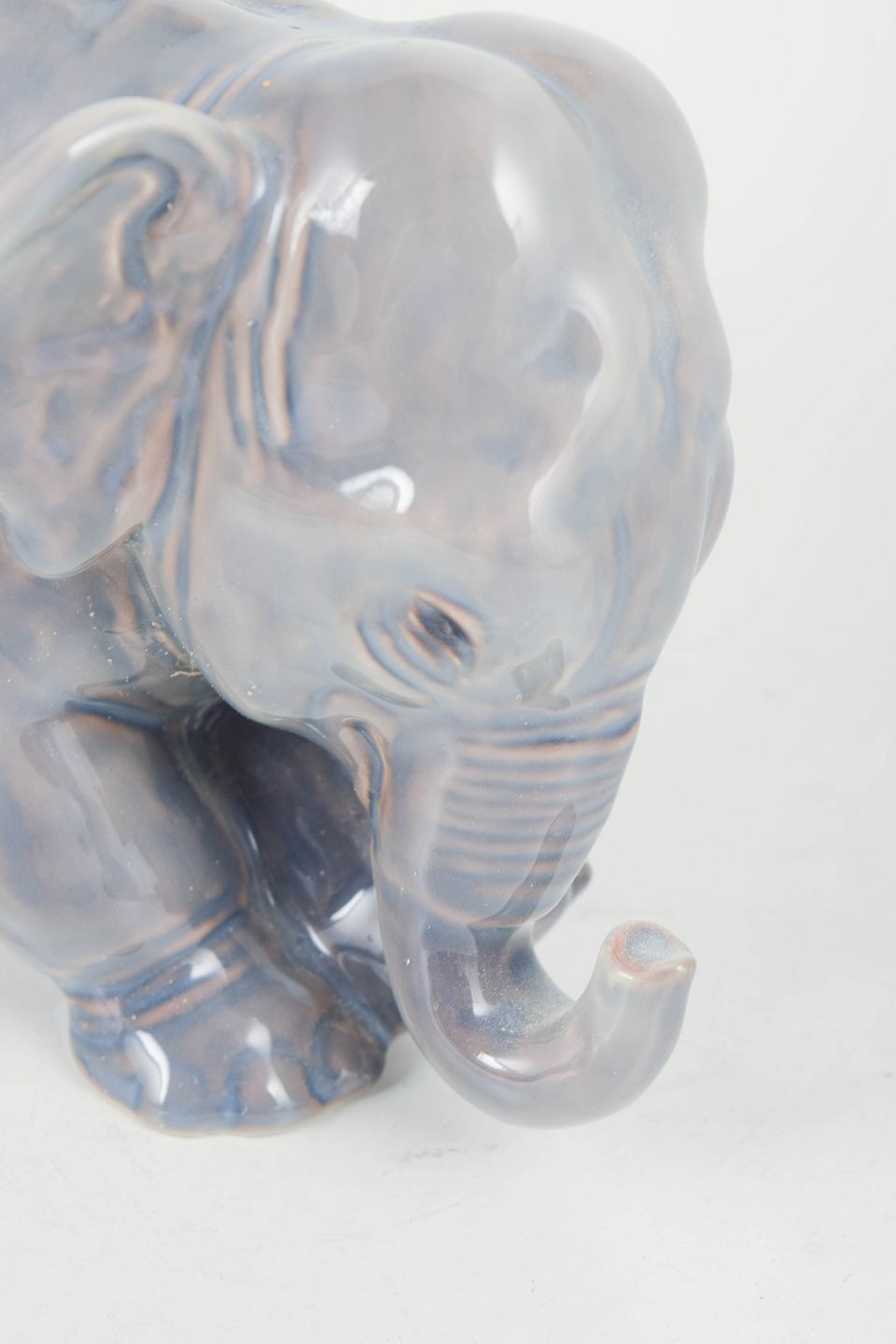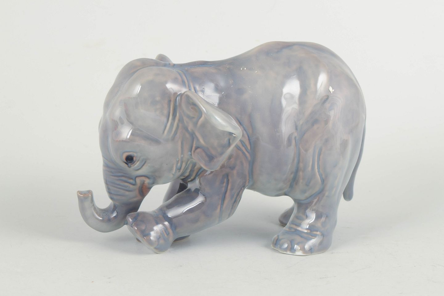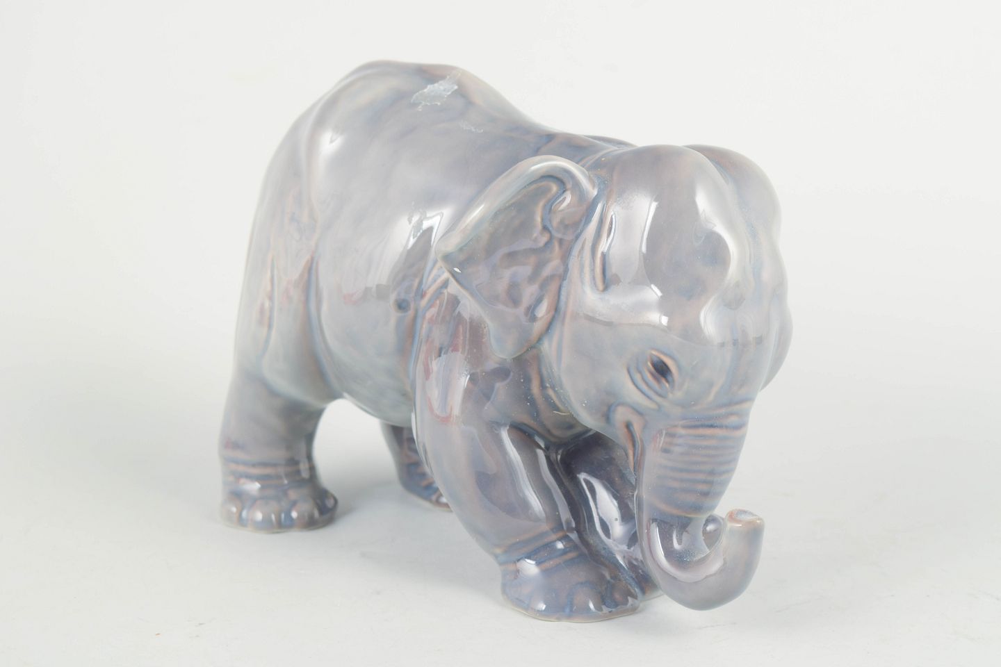 Naturalistisk udformet elefant i porcelæn model 2575 med blød, iriserende glasur i grå og blålige toner. Fremstillet med fine detaljer i overfladen og markeret som første sortering på bunden.