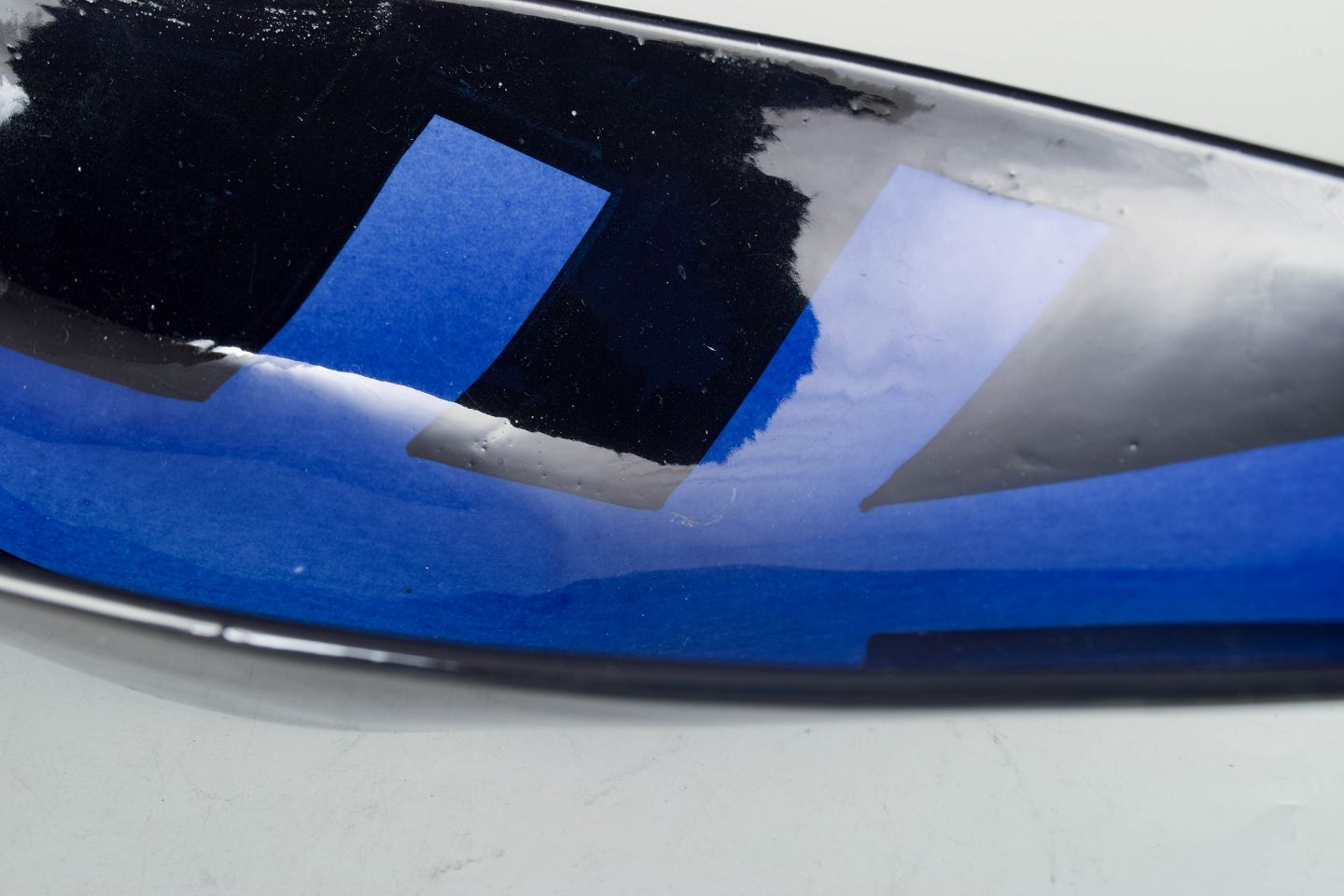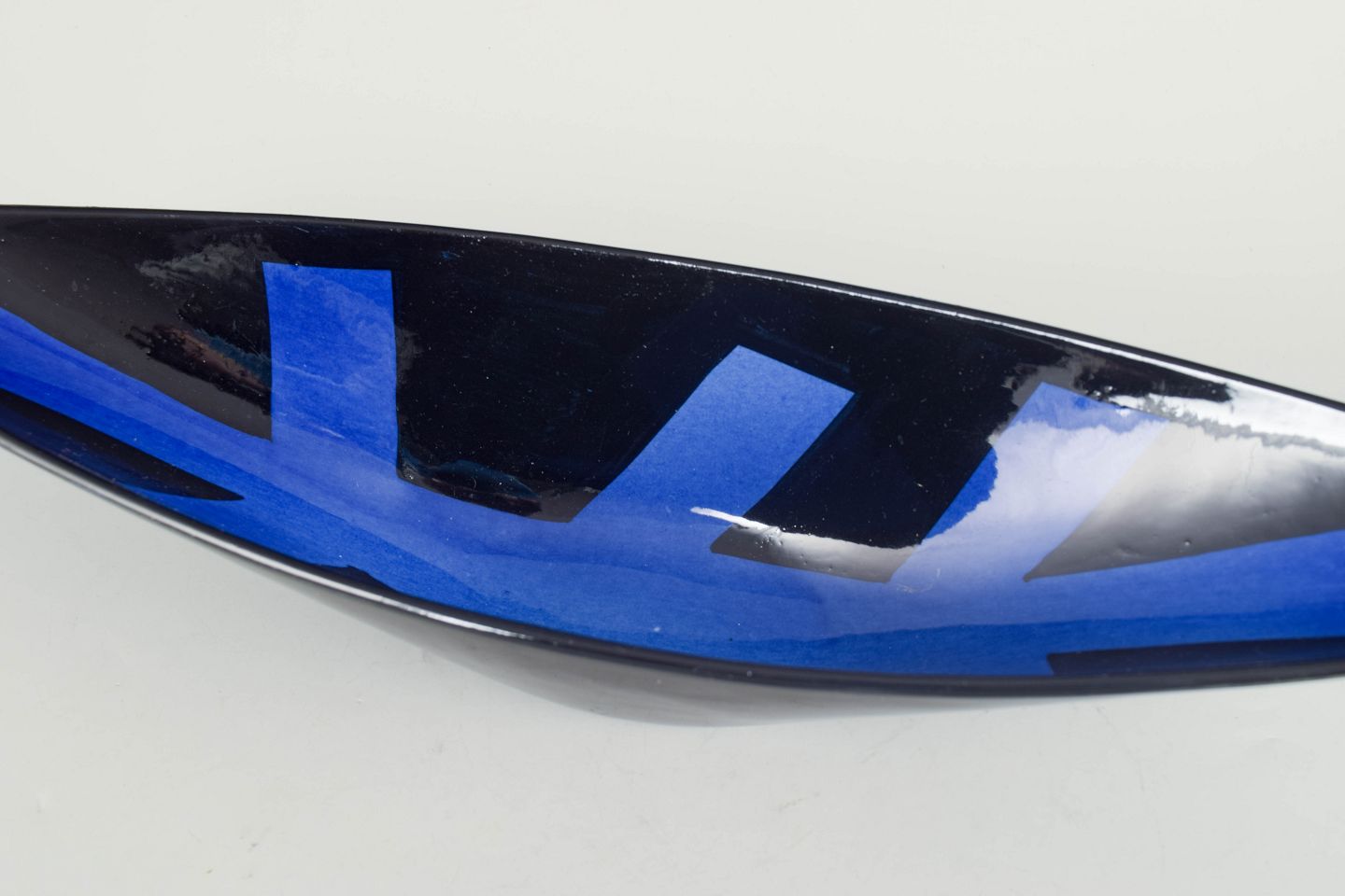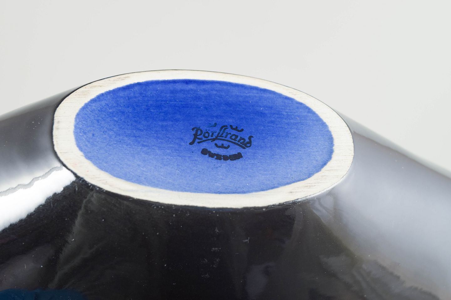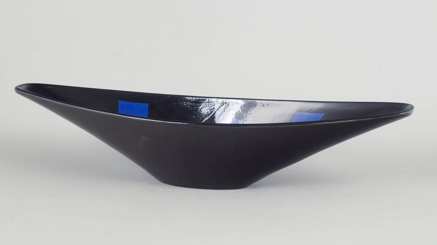 Aflang skål i glaseret keramik med mørk, næsten sort glasur og enkel, modernistisk form. Fabriksmærket i bunden, første sortering.
